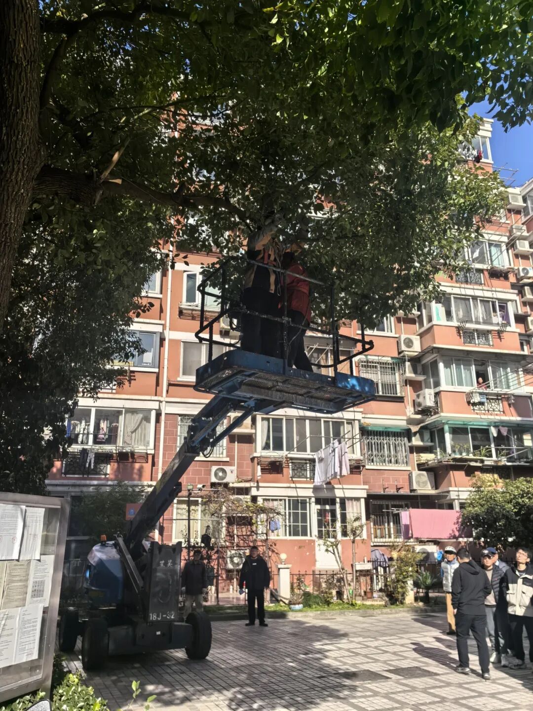 物业公司精心部署,高效落实。作为小区服务管理的责任主体,百特物业公司积极响应居民区党总支号召,在街道的督导下全力推进树木修剪任务:精心筛选具备专业资质的施工团队、落实方案、组织小区业主征询、公示征询结果,并发布修剪通知,详细说明修剪时间、范围、注意事项及便民提示,尽力减少对居民生活的影响。物业还采取“先修剪样板树,再依据居民反馈进行集中修剪”的方式,既通过示范效应直观展示修剪效果,又通过充分沟通兼顾居民改善居住环境的诉求与保护绿化景观的关切。