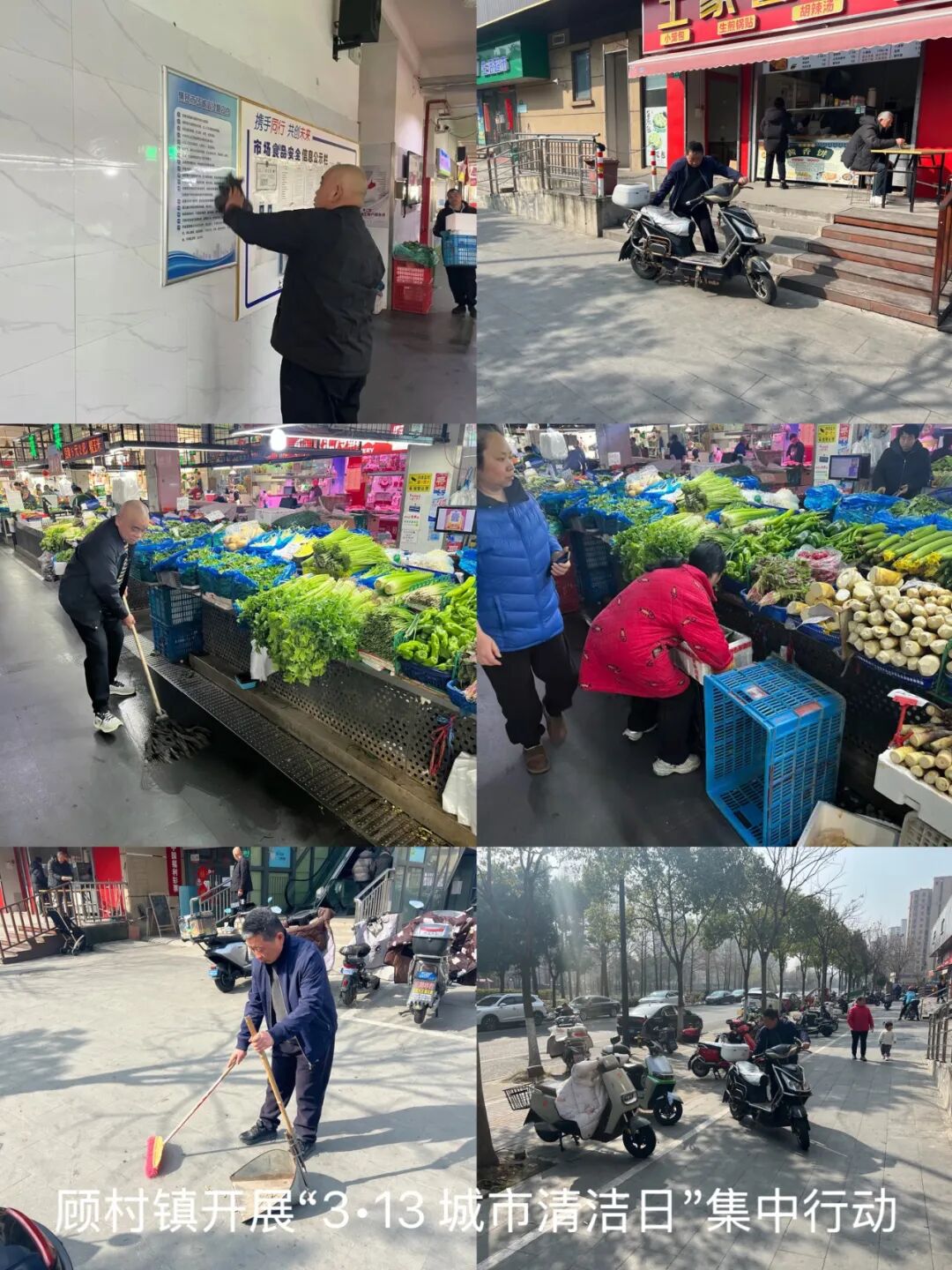 顾村镇在苏家浜路周边区域及顾村公园地铁站附近集中清理共享单车、沿街立面等公共设施上的非法小广告,逐点排查清除。围绕天仁路菜场及周边,清理招牌尘网、冲洗地面污渍、规范占道经营,整治非机动车乱停放,推动商户履行门前责任。对重点道路和核心区域全方位冲洗,清理浮尘杂物及卫生死角。各居民区居委、物业及志愿者参与,清理楼道堆物、铲除小广告,清扫绿化带垃圾,改善小区环境。