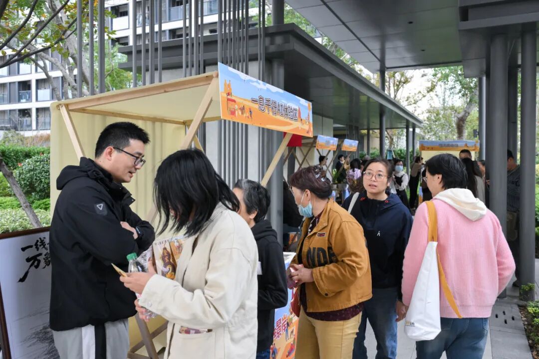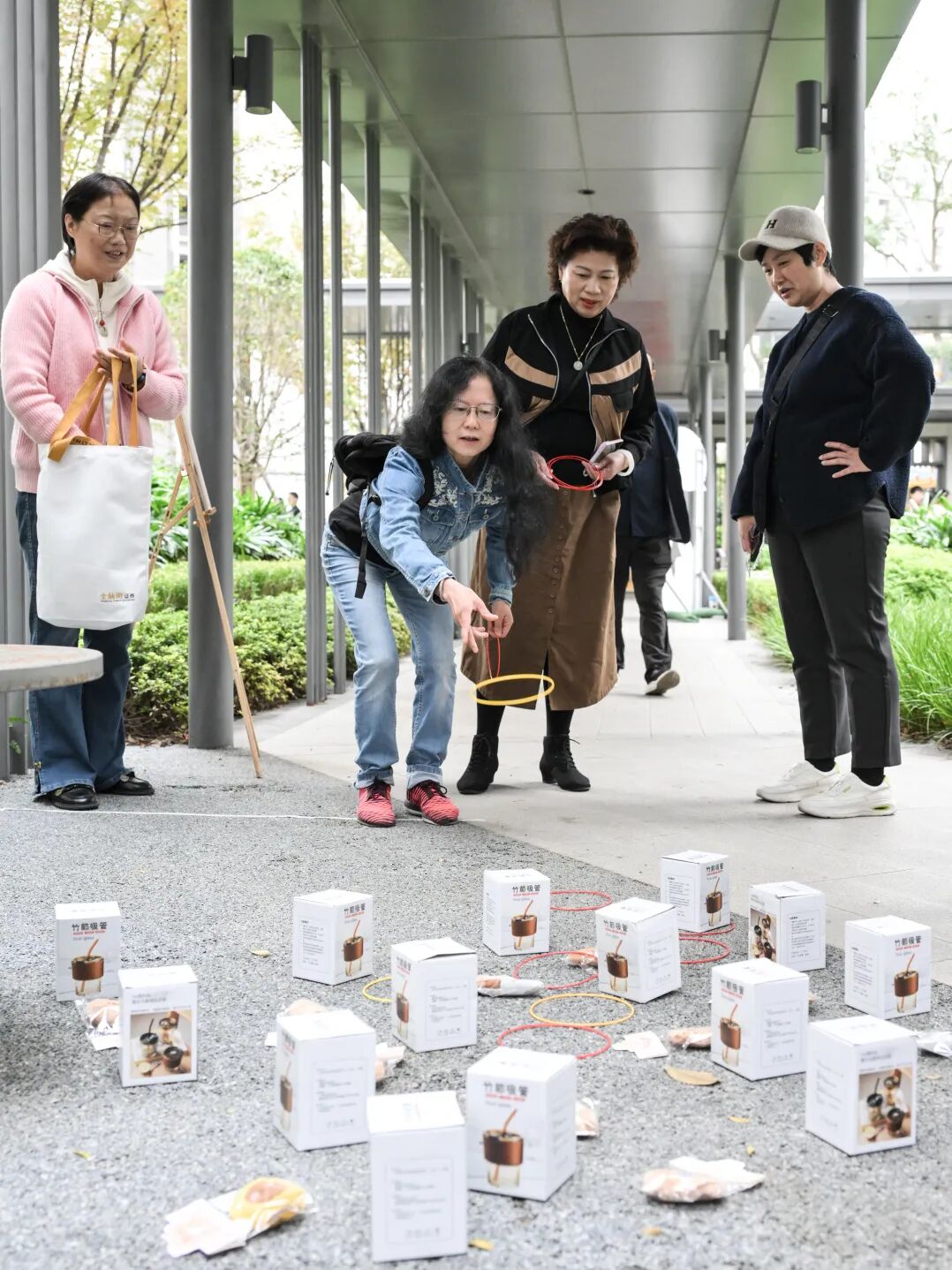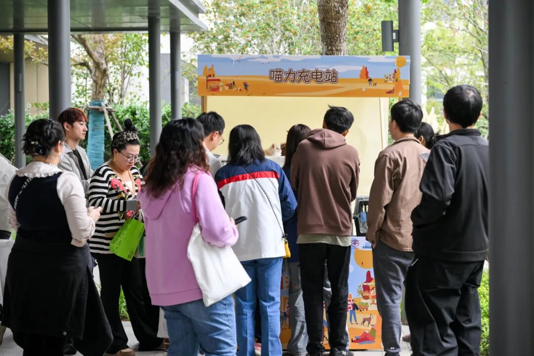 以“公益温情、非遗匠心、青年创业、科技互动”为核心的活力市集区,成为半淞“零距离家园”的生动缩影——公益领养、非遗手工、游戏互动、AI体验、拍照打卡等十余个特色摊位前人头攒动,热闹非凡。【寻遗榭美学空间】将非遗技艺与现代生活相融,居民在亲手制作中感受传统文明的魅力;【喵力充电站】为“铲屎官”们打造萌宠互动天地,让邻里情谊在趣味互动中升温;大学生创业品牌【植营社(植行合一)】构建的迷你植物园,成为青年群体交流分享的自然空间;【一息千行AI体验区】则通过诗词生成、名片设计等互动,让居民在趣味中触摸科技文明,畅想智慧社区生活。