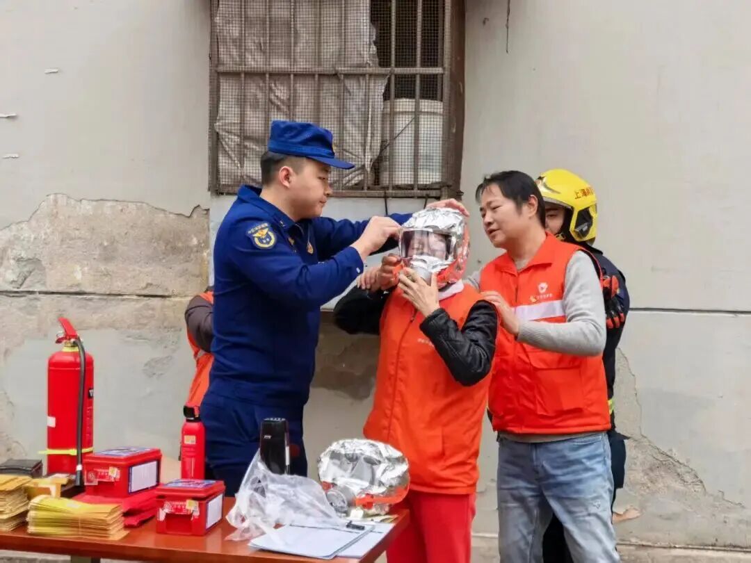 看十遍不如练一次。为让辖区居民更直观地了解火灾的危害和应对方法,消防人员现场演示了灭火器、灭火毯、过滤式消防自救呼吸器等消防器材的正确使用方法,并邀请居民上前进行实操练习。居民们积极参与,在消防人员的专业指导下巩固了基本的消防器材使用技能。
