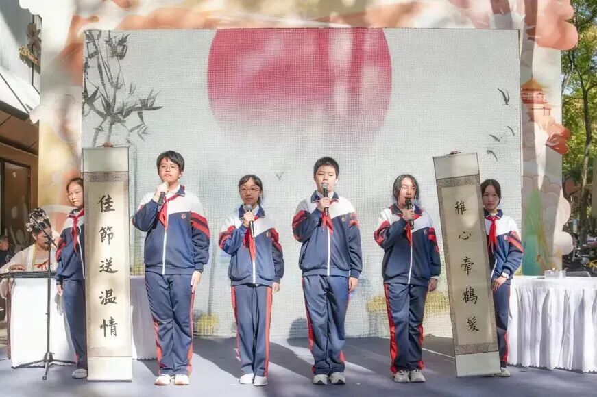 曹家渡街道秋虹舞蹈队的《希望的稻田》拉开本次活动帷幕,灵动舞姿展现秋日生机,瞬间点燃现场氛围。随后,同济大学附属七一中学的学生们带来诗朗诵及书法展示《致重阳》。笔墨隽秀,歌声悠扬,既是年轻一代对传统文化的传承,更是对长辈的诚挚致敬。