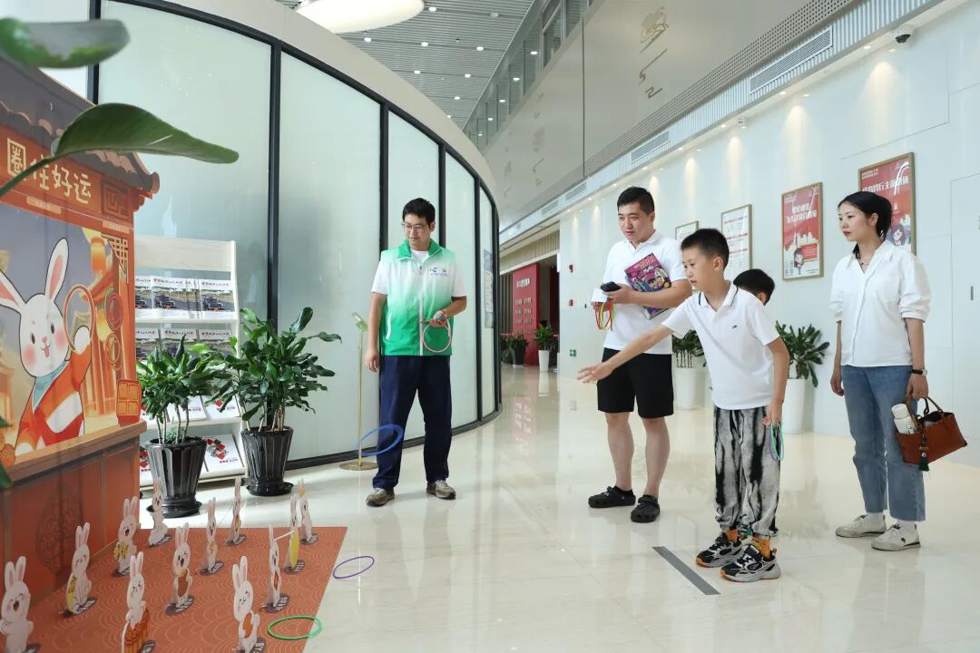 中秋游戏互动区更是欢声笑语不断。“玉兔套圈”前排起了长队,孩子们瞄准目标,期待一击命中;“海底捞月”处,参与者全神贯注,考验手眼协调的同时更添佳节趣味;“投壶邀月”场地则弥漫着古风雅韵,青年们一试身手,体验着古人月下游戏的从容与雅致。这些互动不仅点燃了现场的火热气氛,更让参与者在欢声笑语中切身感受到传统民俗的生命力与感染力。