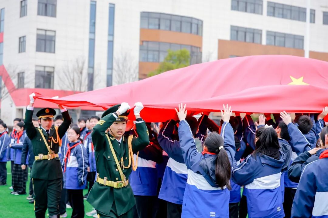 当天上午,董立敢大校走进校园,与青浦区思源中学全体师生共同见证一场震撼人心的“国旗在我心中”新学期升旗仪式。在董立敢大校的亲自指挥下,思源中学国旗仪仗队队员们步伐坚定地护送长5米、宽3.3米的“中国第一旗”从同学们头顶掠过,大家纷纷抬头仰望、伸长手臂与鲜艳的“中国第一旗”进行一次神圣而庄严的“零距离”接触。