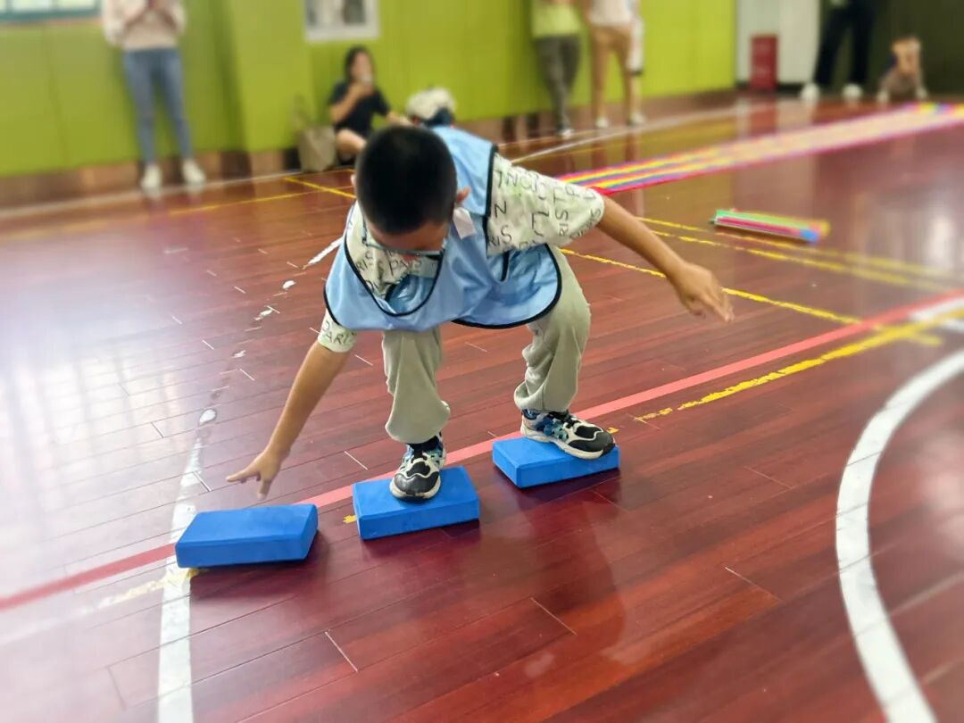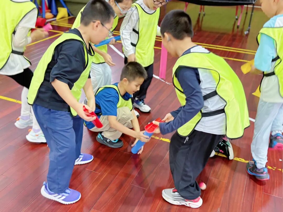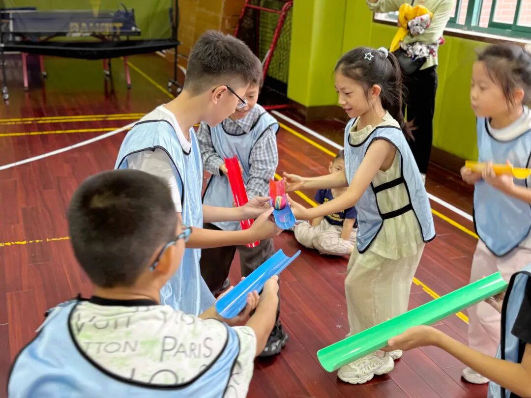 随后,孩子们以小组形式投入协作挑战之中。“摸石头过河”环节,孩子们全神贯注、默契配合,小心翼翼地传递“石头”稳步前行;“能量传输”中,大家手持半管紧密衔接,让小球在默契配合中平稳滑行;“车轮滚滚”时,团队步调一致,齐声呐喊,如同驾驭一条奔腾的七彩长龙。这些精心设计的项目,不仅锻炼了孩子们的身体协调能力,更让他们在合作中真切感受到信任的温暖与团结的力量。