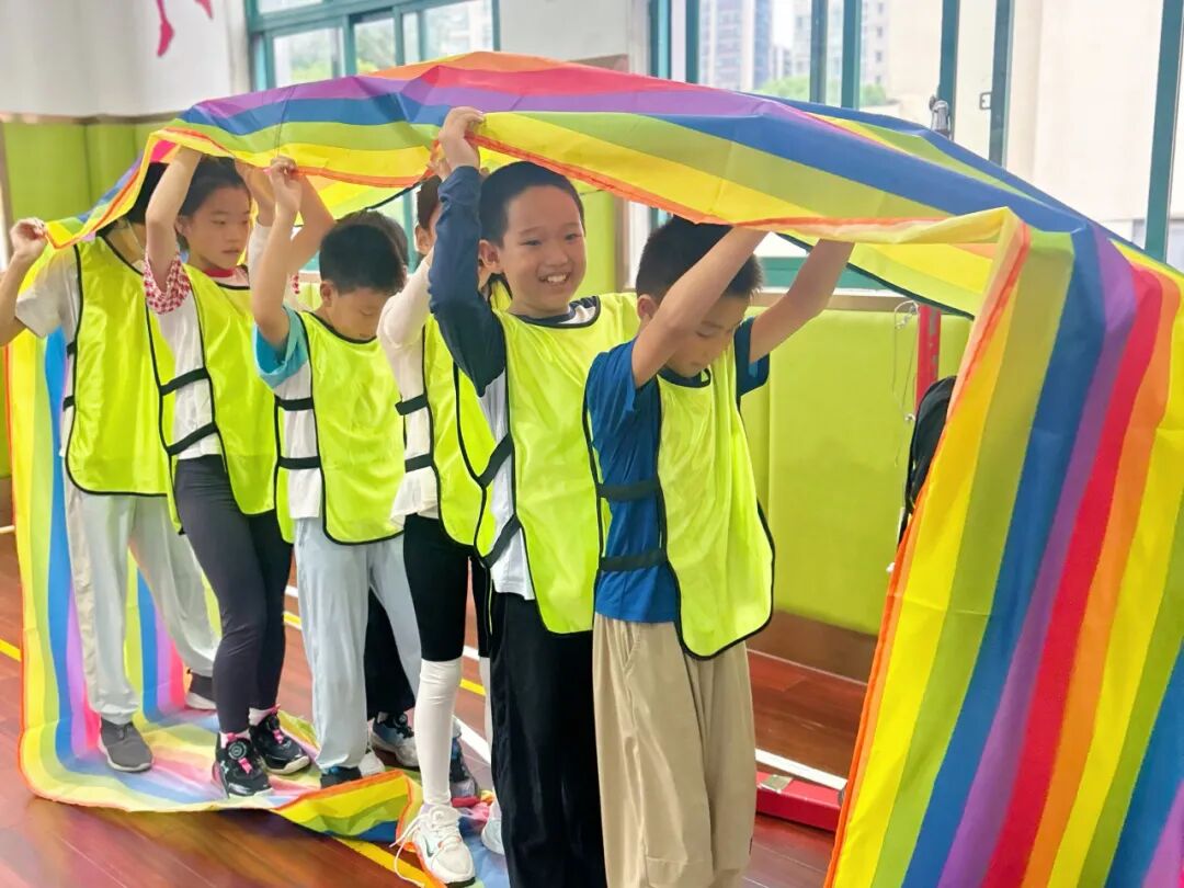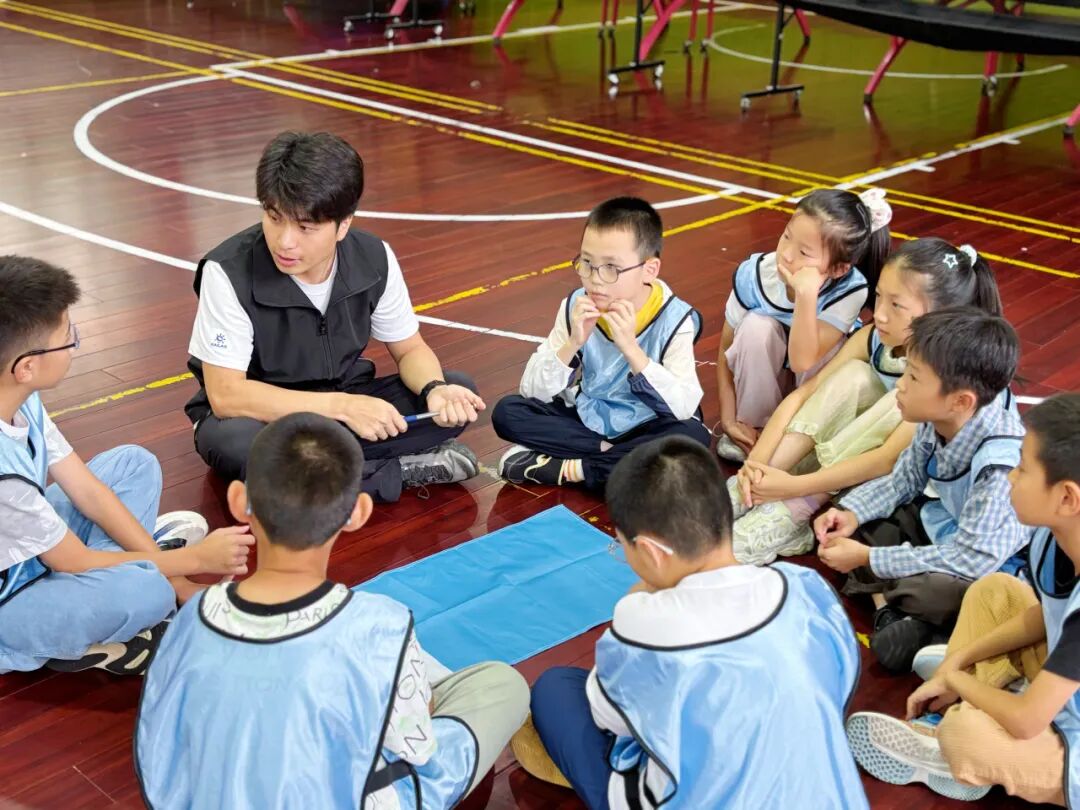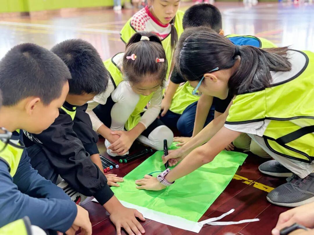 在专业教练的带领下,一场活力四射的开场舞迅速点燃了现场气氛。随后的“蟹王争霸赛”中,孩子们模仿螃蟹横行的可爱姿态,现场欢声笑语此起彼伏。在轻松愉快的氛围中,孩子们迅速拉近了彼此距离,并通过共同设计队旗、制定口号等团队建设环节,初步建立了团队默契,为后续活动顺利开展奠定了良好基础。