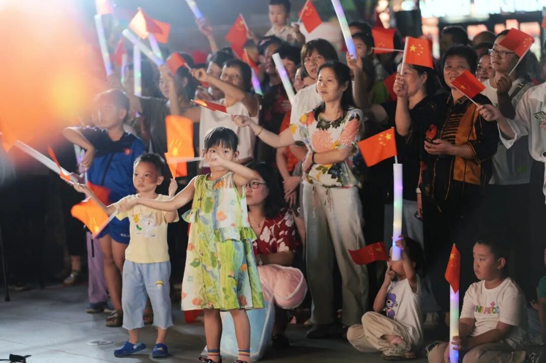 最终,全场观众在手执小国旗和荧光棒的涌动浪潮中,共同高歌《我和我的祖国》,激昂的旋律将现场气氛推向最高点,家国情怀与团圆喜悦在夜空中激情交汇。