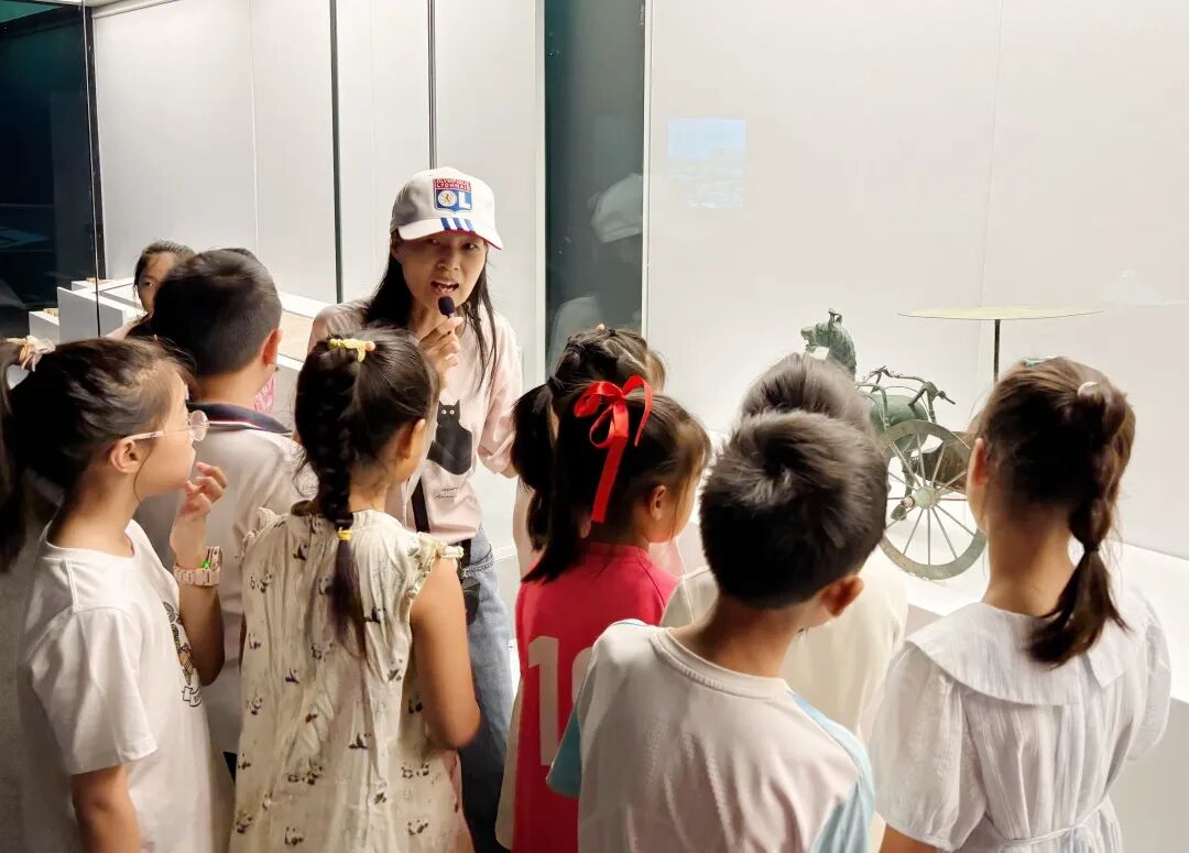 活动伊始,孩子们在导览老师的带领下,参观“登临出世界”主题展览。展陈中既有包括车马仪仗、石造像塔、绘画等珍贵敦煌文物,也有海内外当代创作者以敦煌为灵感创作的精彩艺术作品,形成了一场跨越千年的美学对话。