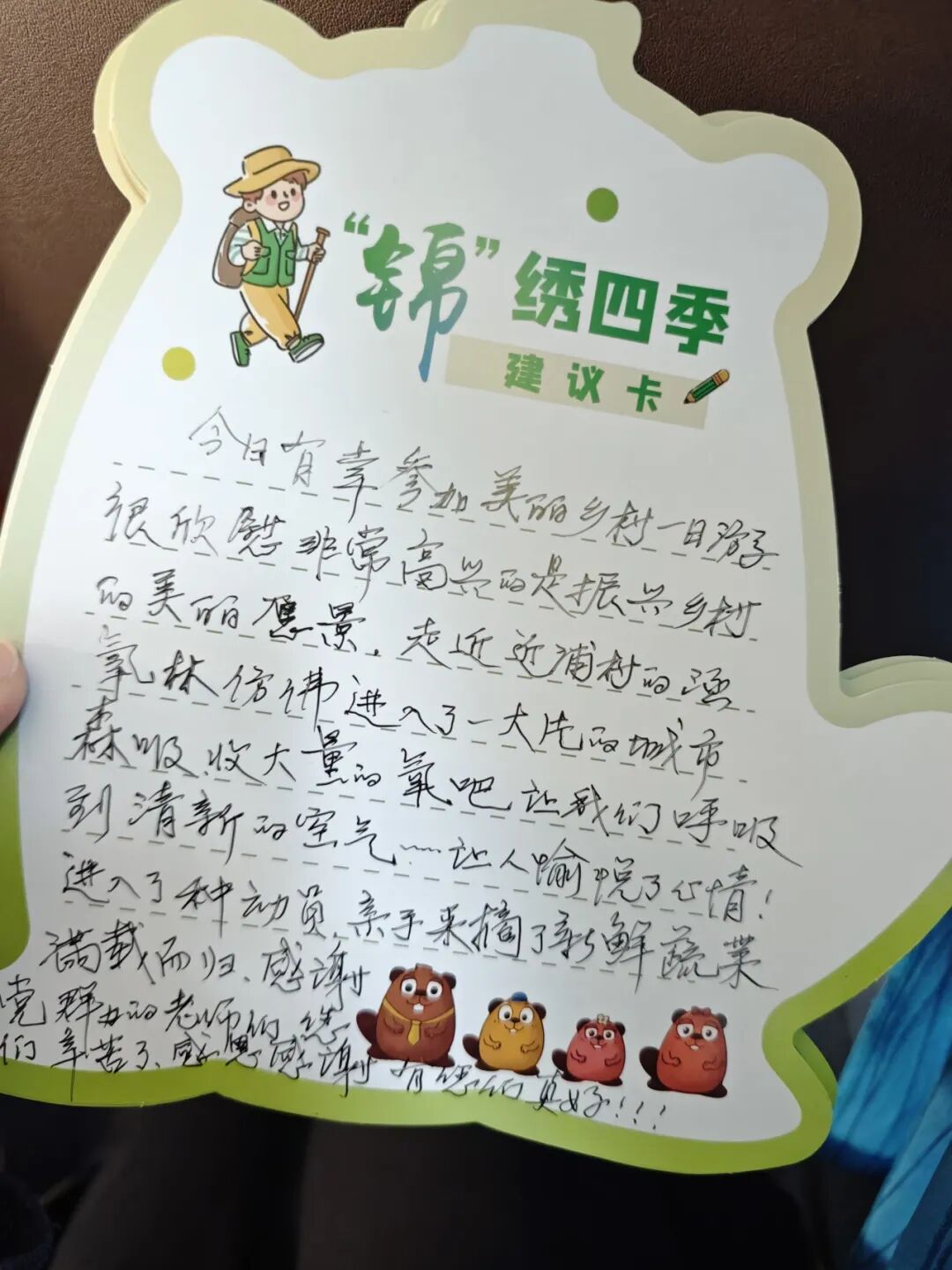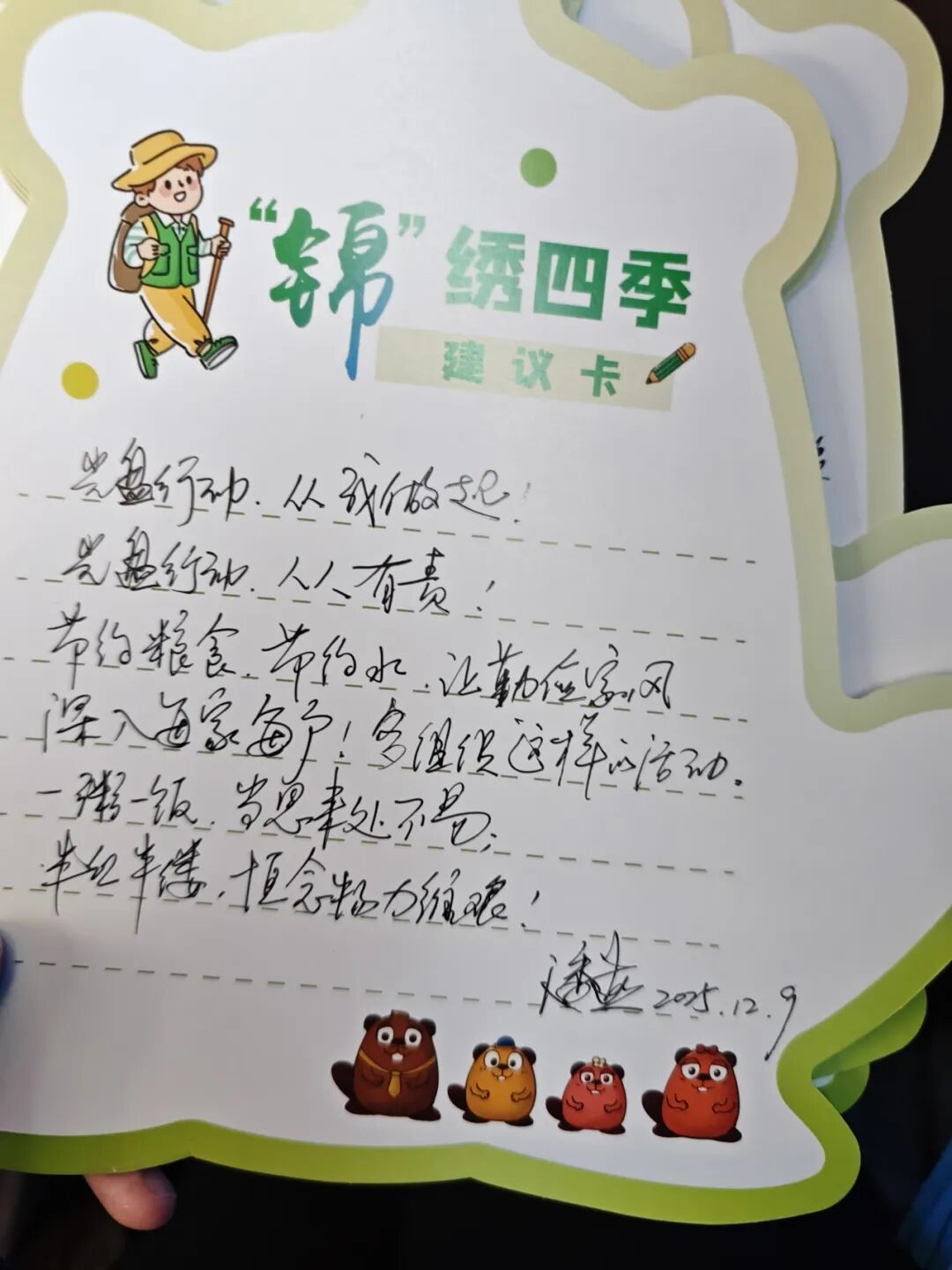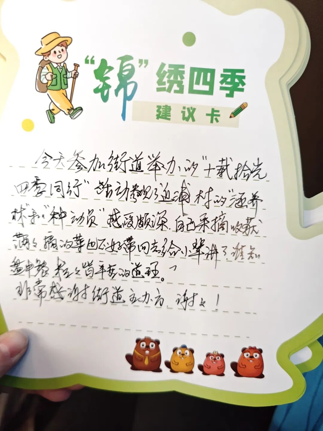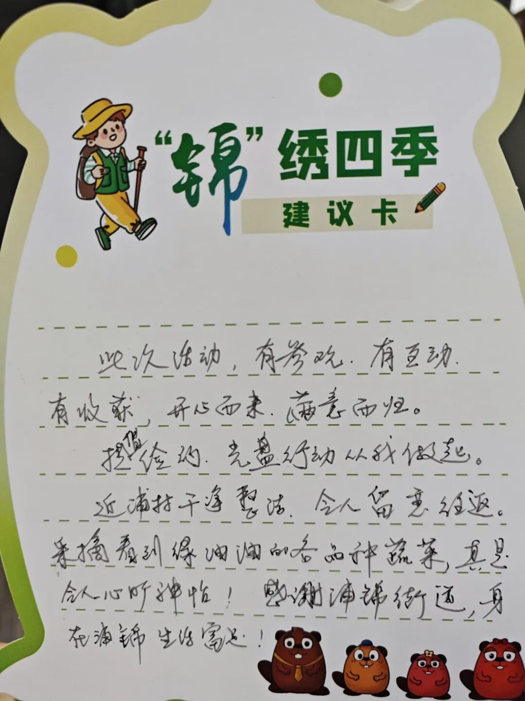 ★建言献策,共话浦锦未来。一张张《活动建议卡》在手中传递,居民们静心沉思,一笔一划写下的,既有对今日所见生态美景的赞叹,更有对浦锦未来发展的殷切期望与宝贵建议。