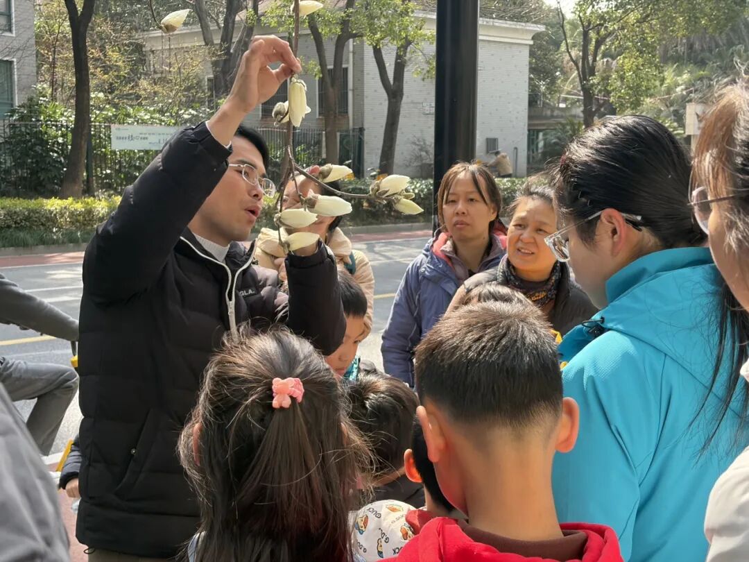 在最期待的户外观察环节,孩子们拉着爸爸妈妈的手,穿梭在富平路的玉兰树间,化身小小植物探险家,近距离“打卡”各类玉兰花。大家踮着脚尖、睁大眼睛,认真分辨白玉兰的纯粹、紫玉兰的艳丽、二乔玉兰的温柔渐变,还特意寻找广玉兰那像荷花般硕大的花朵和厚实的常绿叶片,你一言我一语地分享自己的发现,好奇地追问着老师关于玉兰的小秘密,现场满是清脆的笑声和稚嫩的追问,亲子间的默契在并肩探索中悄然升温,氛围感直接拉满!