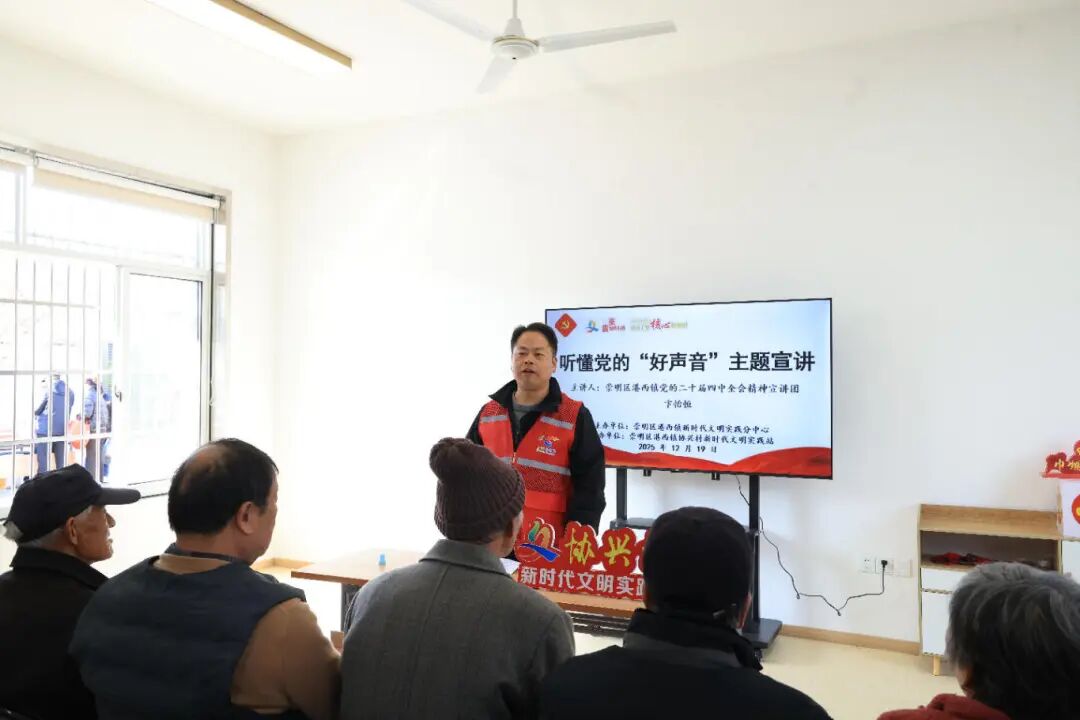 邀请镇“初心港”理论政策宣讲团成员,围绕学习贯彻党的二十届四中全会精神进行主题微宣讲,用群众喜闻乐见的方式传递上级政策,用身边生动事例、朴素的话语引起村民群众的共鸣。