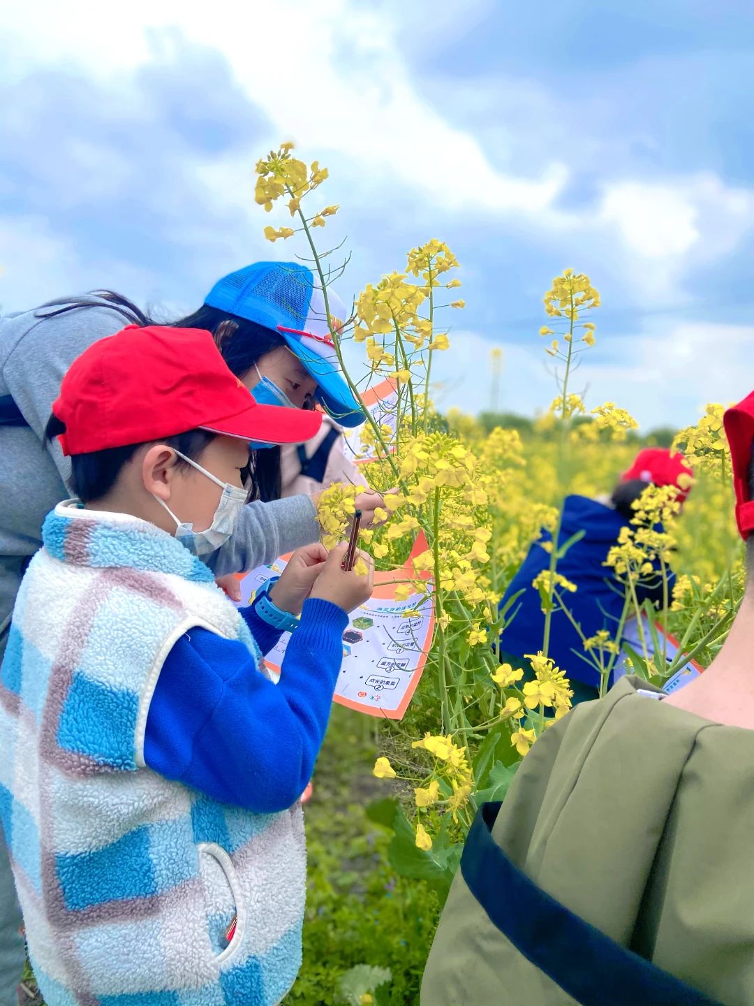 故事会之后大家进入油菜花研学课堂,根据年龄段分组,小龄段跟着老师一起动手制作油菜花花篮,大龄段跟着老师探索油菜花的结构和相关植物知识,不同年龄的孩子都获得了完整而丰富的体验。