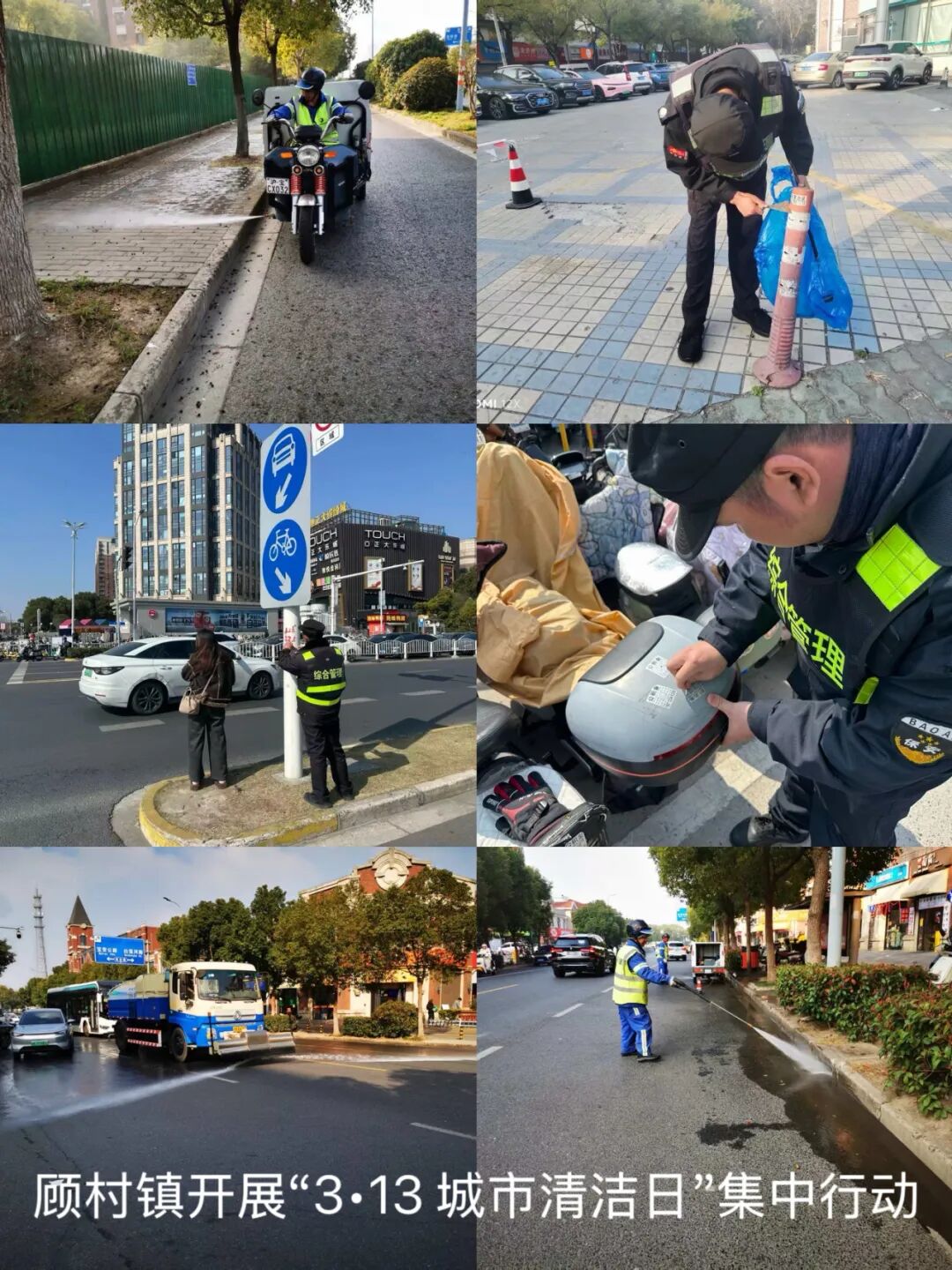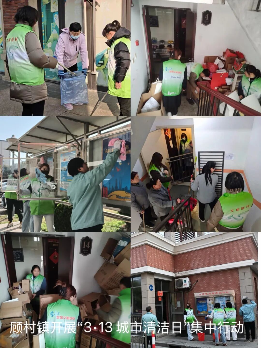 顾村镇在苏家浜路周边区域及顾村公园地铁站附近集中清理共享单车、沿街立面等公共设施上的非法小广告,逐点排查清除。围绕天仁路菜场及周边,清理招牌尘网、冲洗地面污渍、规范占道经营,整治非机动车乱停放,推动商户履行门前责任。对重点道路和核心区域全方位冲洗,清理浮尘杂物及卫生死角。各居民区居委、物业及志愿者参与,清理楼道堆物、铲除小广告,清扫绿化带垃圾,改善小区环境。