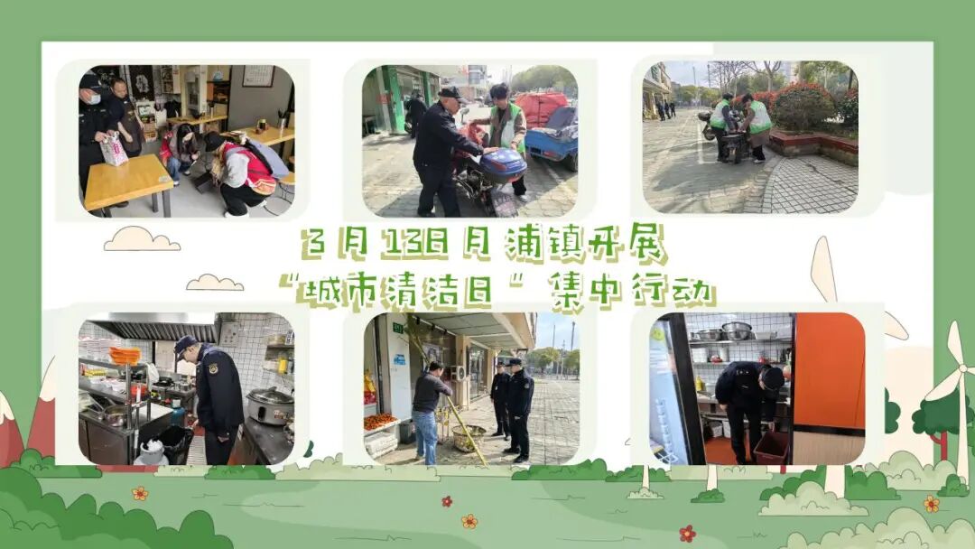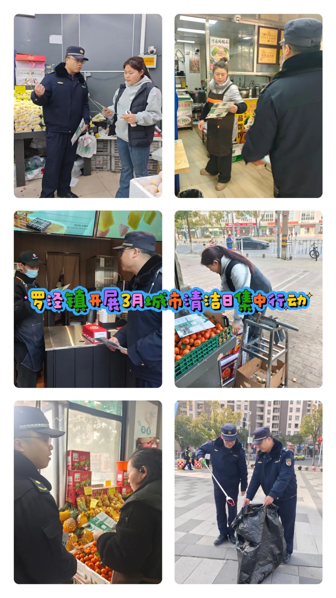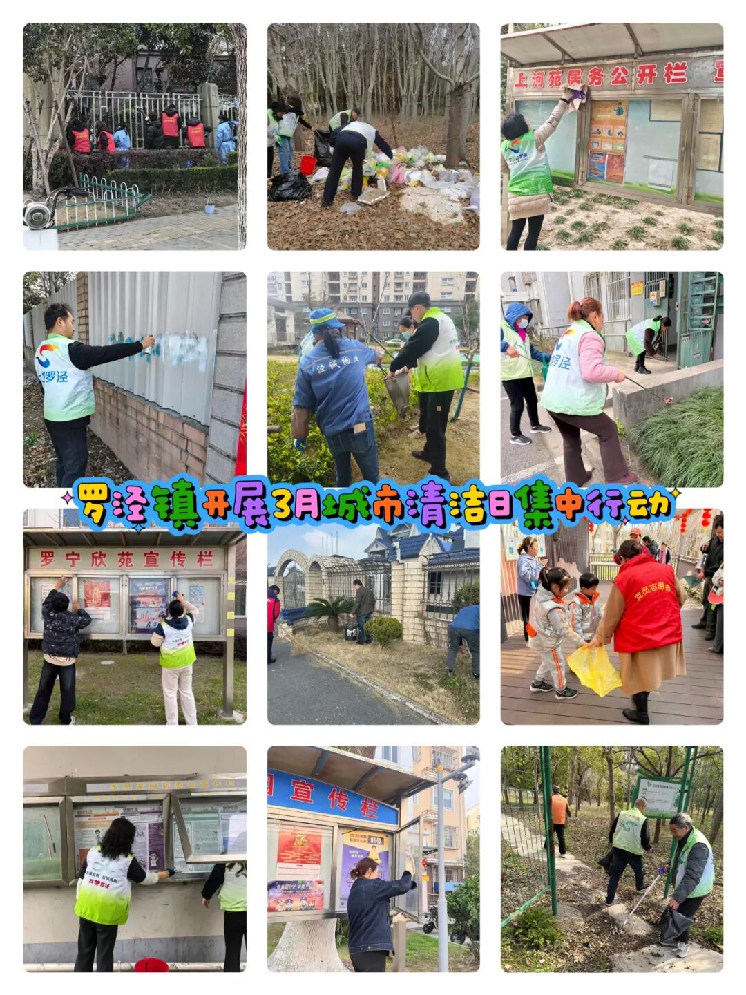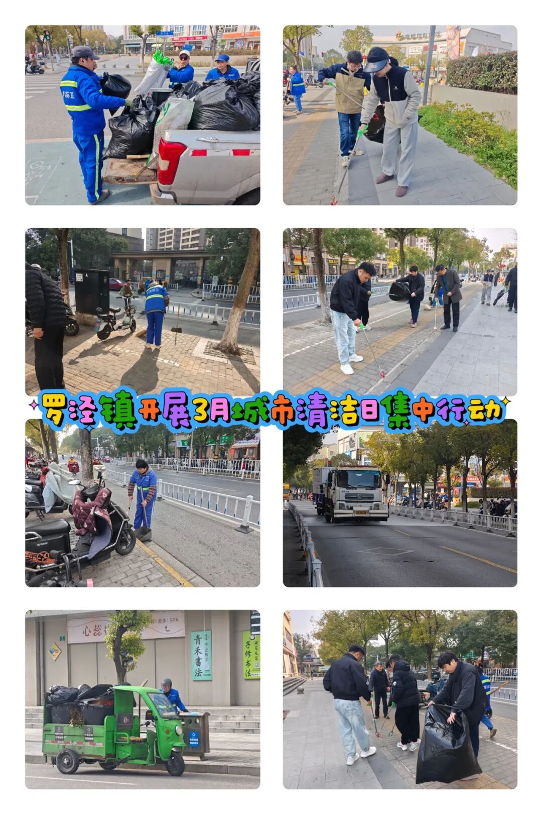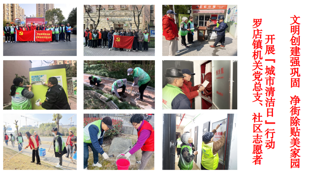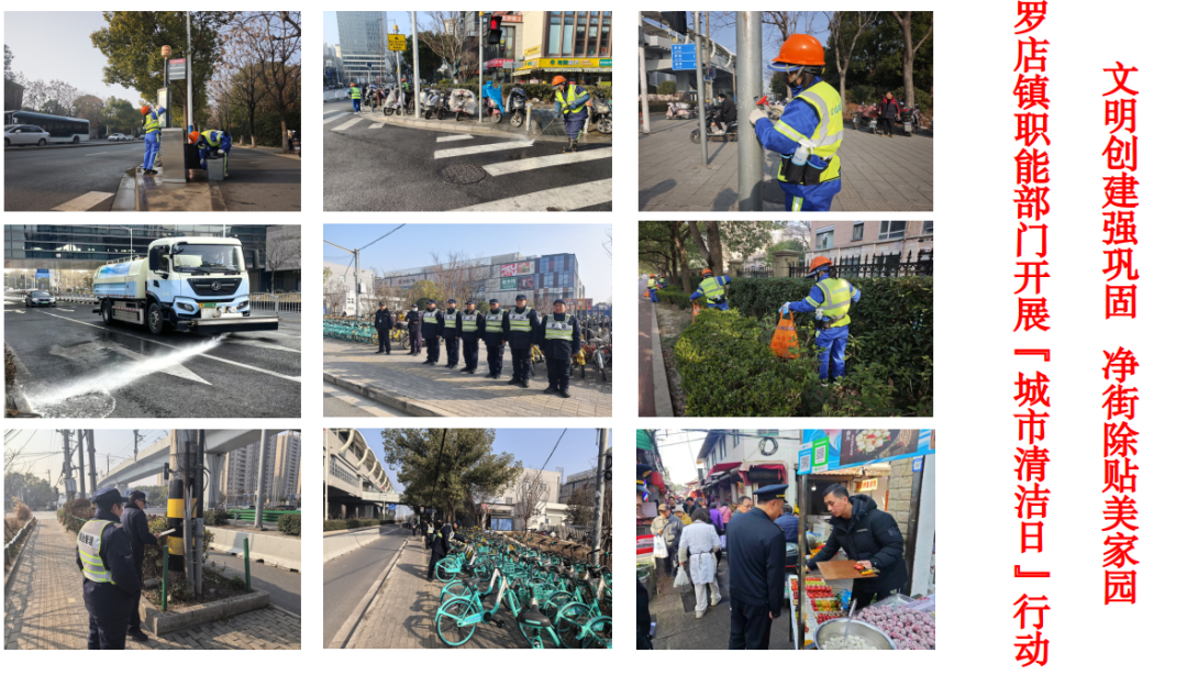 罗店镇机关总支、居民区志愿者、物业对朗诗绿岛、郡园、鼎苑、慧苑四点位小区及周边背街小巷开展保洁、清垃圾、除小广告;月罗环卫、罗星公司对四小区周边指定道路进行清洗。镇综合执法队、保利物业等在美兰湖地铁站、中集金地广场规范车辆停放、清除小广告;市场监管所对清美菜场环境管理进行指导,共同推进美丽城区建设、巩固文明创建成果。