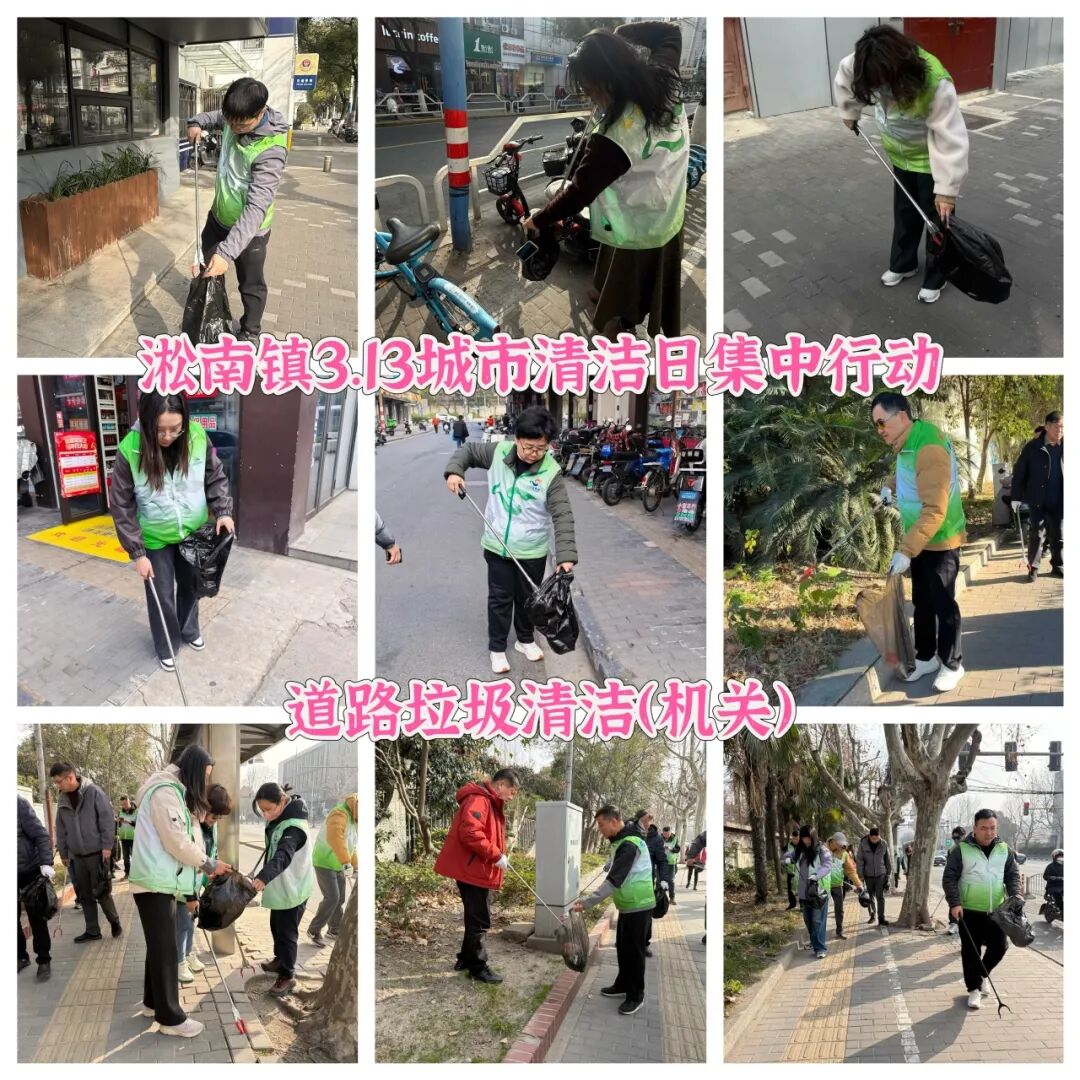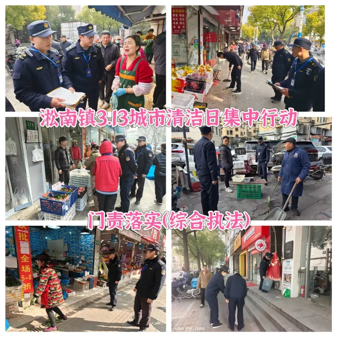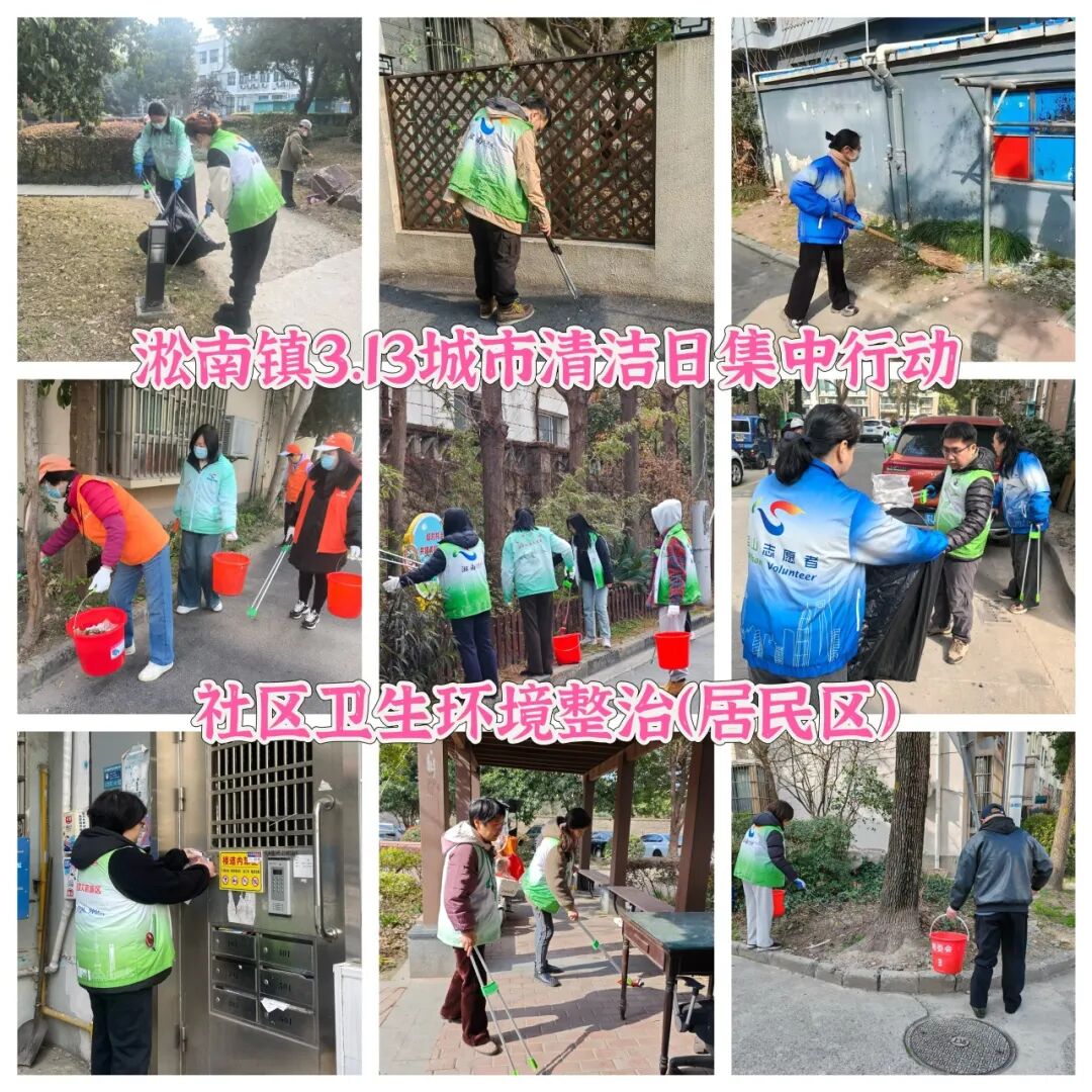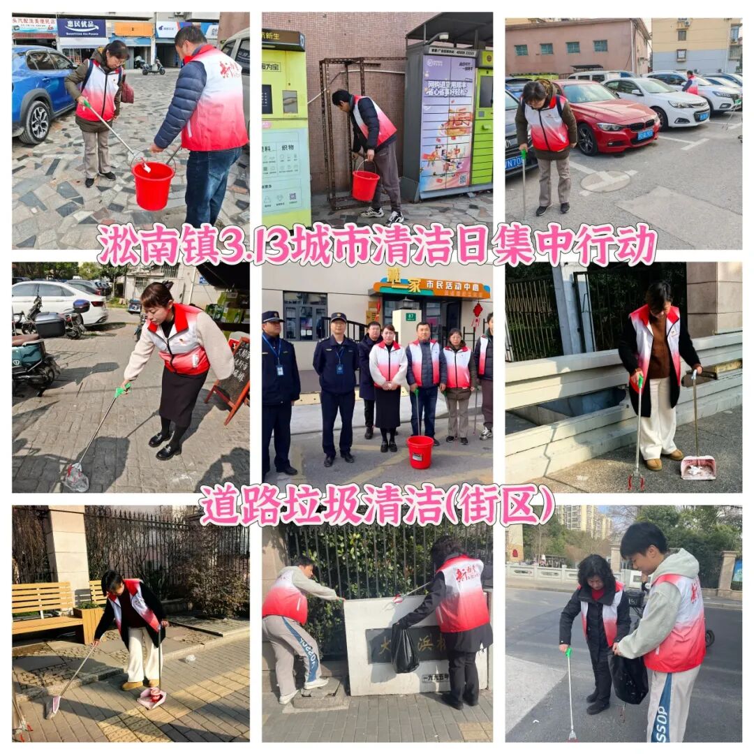 淞南镇充分发动辖区内党政机关干部、街区党支部成员、综合行政执法队、居民区志愿者以及镇环卫市容保障等力量共同参与城市清洁集中行动。机关干部和街区党支部成员重点对责任区域内的人行道路面等公共区域进行深度清理;镇综合行政执法队员逐户走访沿街商铺,发放《门责告知书》和《全域门责宣传册》,同步开展责任宣传与执法检查;各居民区志愿者全面整治小区内部环境,开展垃圾分类宣传;镇环卫市容专业队伍对薄弱区域道路实施深度冲洗和精细化保洁。