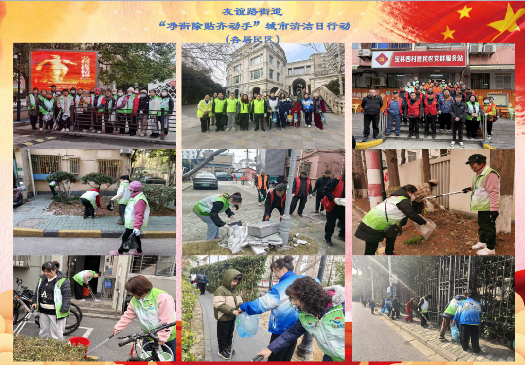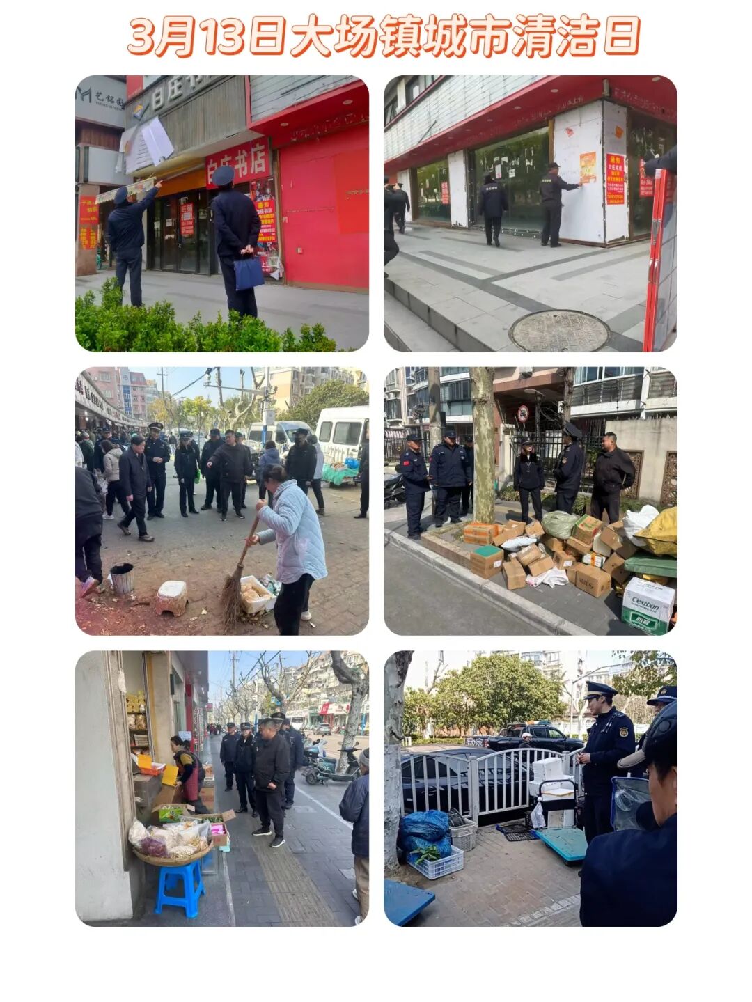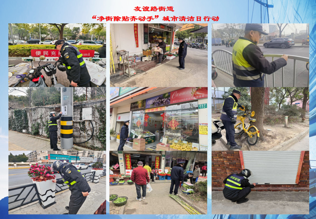 大场镇聚焦全域门责重点街区、重点小区、文明实践站及菜场市场周边,集中开展 “净街除贴齐动手”城市清洁日行动。各重点小区开展环境清整、小包垃圾与干湿垃圾混投专项整治及社区大扫除;镇综合行政执法中队对重点街区商铺、店招、雨棚、外摆位、公共休憩座椅等开展执法检查;环卫部门对重点道路区域集中清理共享单车、沿街立面及公共设施上的非法小广告,切实维护市容环境整洁。