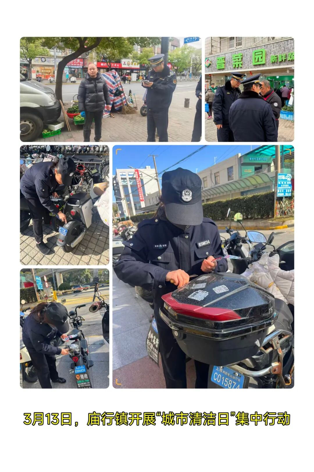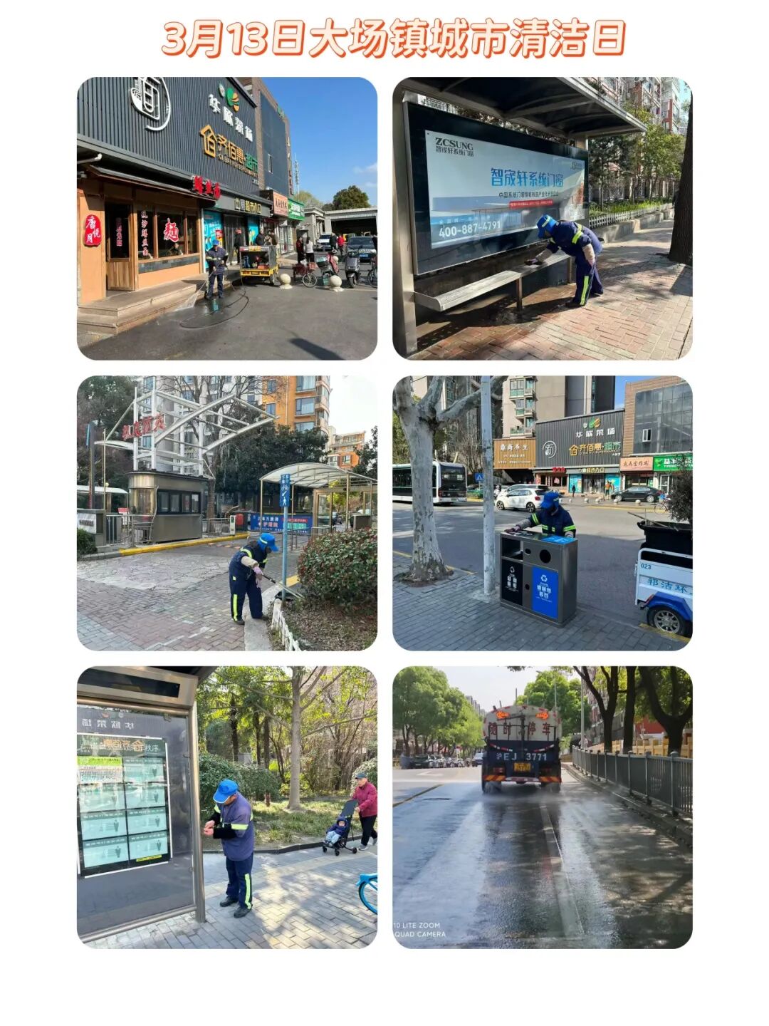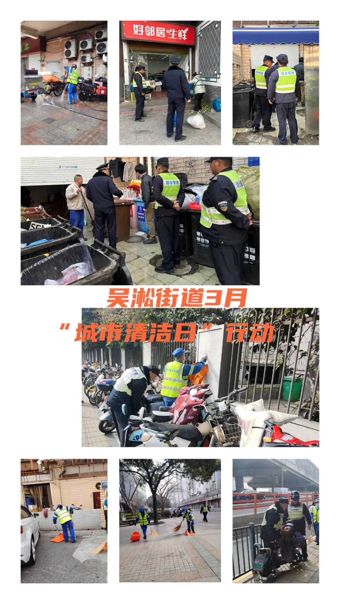 大场镇聚焦全域门责重点街区、重点小区、文明实践站及菜场市场周边,集中开展 “净街除贴齐动手”城市清洁日行动。各重点小区开展环境清整、小包垃圾与干湿垃圾混投专项整治及社区大扫除;镇综合行政执法中队对重点街区商铺、店招、雨棚、外摆位、公共休憩座椅等开展执法检查;环卫部门对重点道路区域集中清理共享单车、沿街立面及公共设施上的非法小广告,切实维护市容环境整洁。