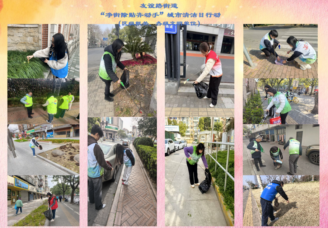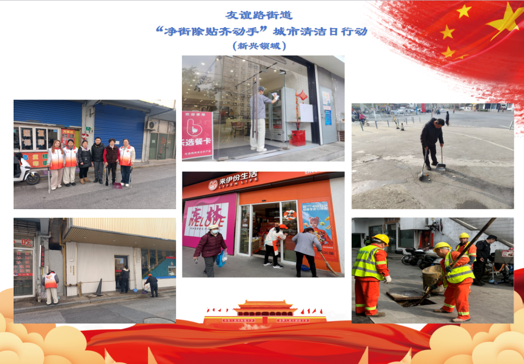 友谊路街道充分发动辖区党政机关、企事业单位、居民区、物业以及新兴领域等志愿者力量,以及综合执法队、环卫等职能部门等共同参与。街面上,机关干部、职能部门以及各商户等,重点对集贸市场、重点小区周边道路及背街小巷,特别是绿化带垃圾及各类卫生死角等开展“小广告”清理以及道路清扫、非机动车无序停放清整、跨门营业等集中行动。在小区,特别是重点小区,居委物业和志愿者们一起清理小区围墙内外卫生死角、清除“小广告”、清理乱堆物、整治乱停车等。