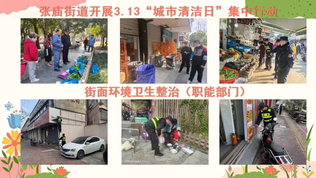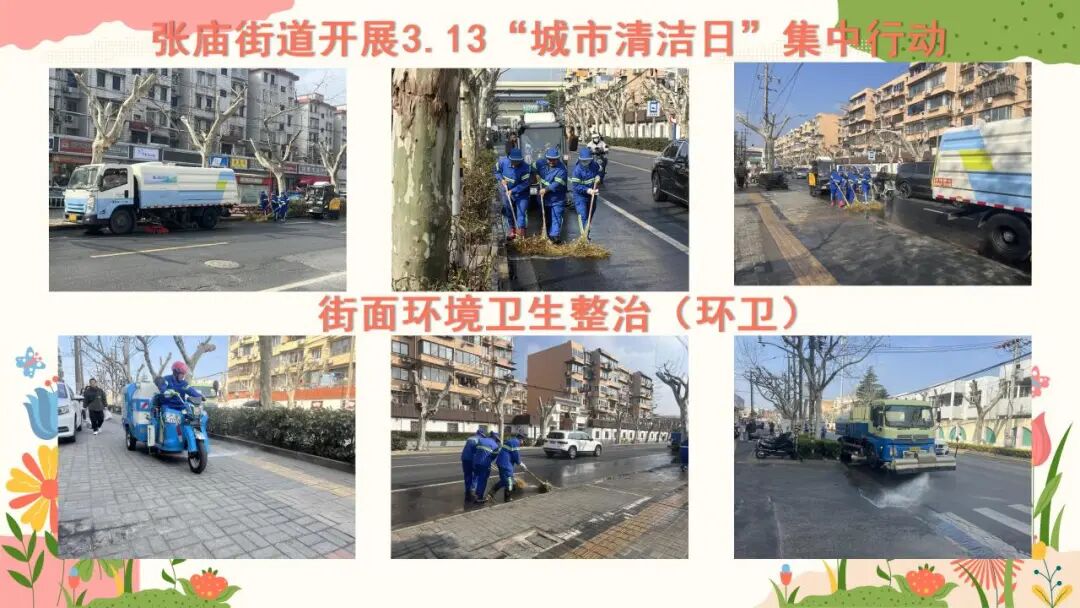 张庙街道机关志愿者前往小区周边、背街小巷等重点区域,开展垃圾捡拾、共享单车归位、非法小广告清理等工作,对公共区域进行全面清扫,积极引导市民文明停放非机动车,共同维护公共秩序。社区志愿者以楼栋楼道为重点,清理堆积杂物、整治卫生盲区,严查小包垃圾乱扔、垃圾分类不到位等问题,并面向居民做好宣传引导工作。城管执法队员逐户上门开展门责检查与普法宣传,督促商户履行市容维护义务,自觉做好门前区域、店招、雨棚、外立面等清洁工作。净南环卫公司采用机械化作业方式,对辖区主次干道、重点片区进行全面冲洗与深度保洁,大幅提升道路整洁水平。