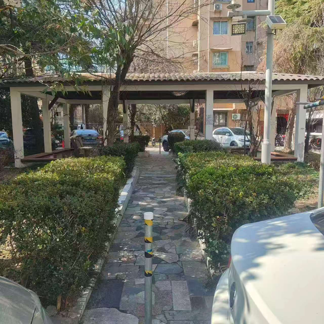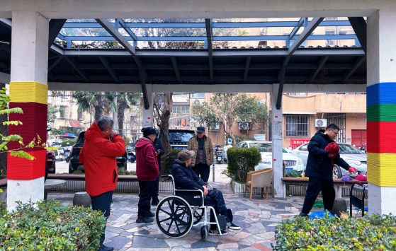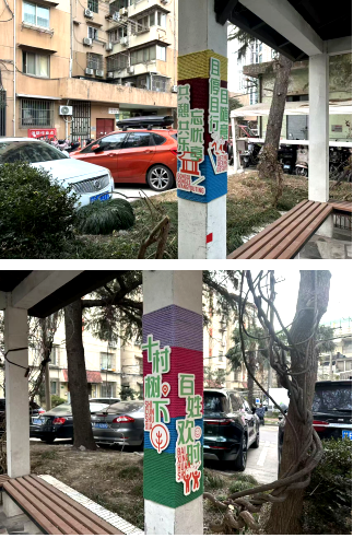 微改造,重塑树下空间。功能凉亭的顶换成了玻璃透光顶,阳光洒下来,暖洋洋的,雨天再也不用躲。柱子上缠上了彩色绒线,红的、黄的、绿的,像给老社区穿上了一件新毛衣。树下多了一块块温馨的标语牌,字不多,却让人看了心头一暖。