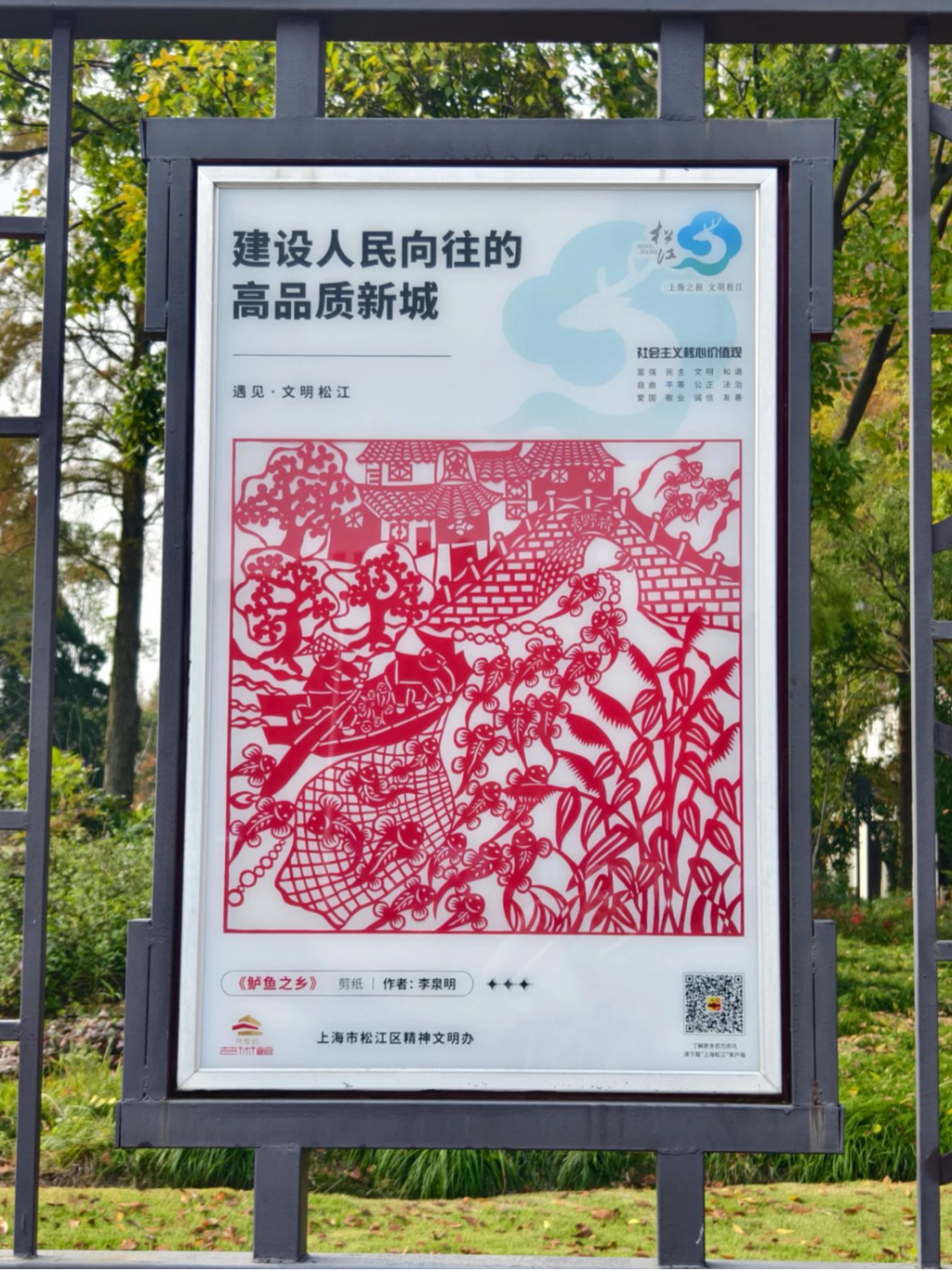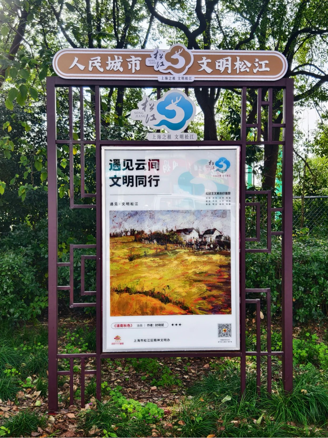 12月3日上午,记者先后来到松江人民北路、嘉松南路、龙马路、文汇路,看到了设在路旁的“遇见·文明松江”专栏,一幅幅基于新城新貌、山水景观、民俗场景等松江特色元素而创作的艺术作品格外亮眼。