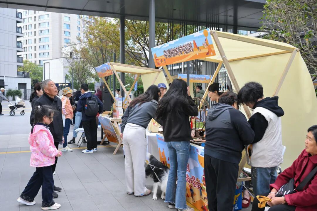 以“公益温情、非遗匠心、青年创业、科技互动”为核心的活力市集区,成为半淞“零距离家园”的生动缩影——公益领养、非遗手工、游戏互动、AI体验、拍照打卡等十余个特色摊位前人头攒动,热闹非凡。【寻遗榭美学空间】将非遗技艺与现代生活相融,居民在亲手制作中感受传统文明的魅力;【喵力充电站】为“铲屎官”们打造萌宠互动天地,让邻里情谊在趣味互动中升温;大学生创业品牌【植营社(植行合一)】构建的迷你植物园,成为青年群体交流分享的自然空间;【一息千行AI体验区】则通过诗词生成、名片设计等互动,让居民在趣味中触摸科技文明,畅想智慧社区生活。