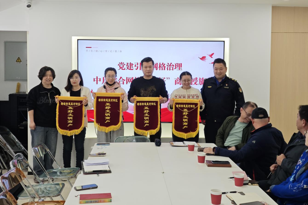 蓝村街区党支部书记陈智华与街居理事会代表共同为获评的首批“五好文明商户”授旗。一面面鲜艳的旗帜,既是对获评商户文明经营、积极参与共治的肯定与表彰,也是街居理事会搭建激励平台、凝聚共治合力的生动实践。获评商户们纷纷表示,将以此次授旗为契机,做好文明经营的表率,带动周边同行共同践行规范经营理念,一起为提升蓝村街区治理水平、打造更美好的街区环境贡献力量。