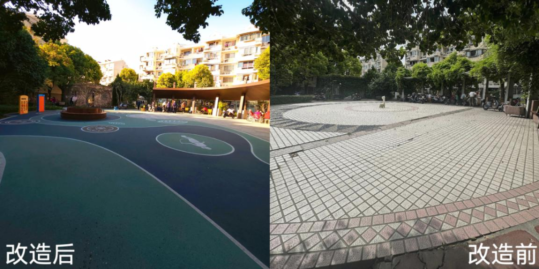 在基础安全和功能完善方面,改造团队对地面进行了分区铺装。健身区和儿童活动区换上了塑胶地垫,缓冲防滑又透水,健身、玩乐更安心。通行区和广场则选用坚固耐磨的花岗岩,确保出行顺畅,也经得起长久使用。原来的休闲广场廊架也变了样——加装了遮阳遮雨的顶棚,成了实用、风雨无阻的“社区共享客厅”,居民们在这里聊天、下棋,空间“活”了,邻里也更亲近了。