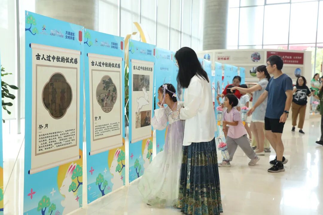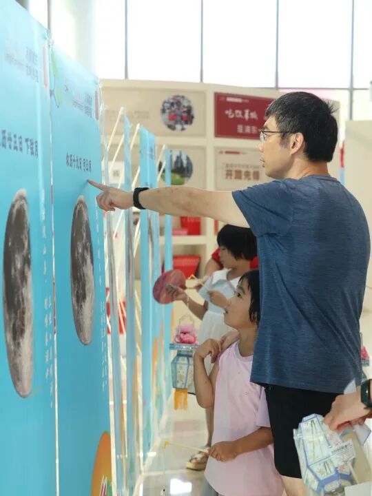 往里走,中秋灯谜区人头攒动,一条条谜面随风轻摆,引得市民游客或低头沉思,或热烈讨论,在趣味挑战中增进对传统文化的了解。一旁的展板则通过生动的月相图,为大家揭示了月亮从农历初一的新月,历经上弦月、满月,再到廿七残月的盈亏变化规律。