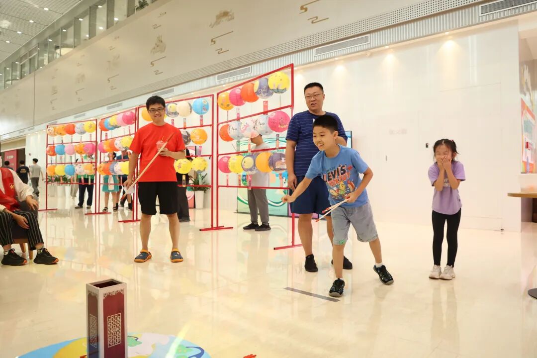 中秋游戏互动区更是欢声笑语不断。“玉兔套圈”前排起了长队,孩子们瞄准目标,期待一击命中;“海底捞月”处,参与者全神贯注,考验手眼协调的同时更添佳节趣味;“投壶邀月”场地则弥漫着古风雅韵,青年们一试身手,体验着古人月下游戏的从容与雅致。这些互动不仅点燃了现场的火热气氛,更让参与者在欢声笑语中切身感受到传统民俗的生命力与感染力。