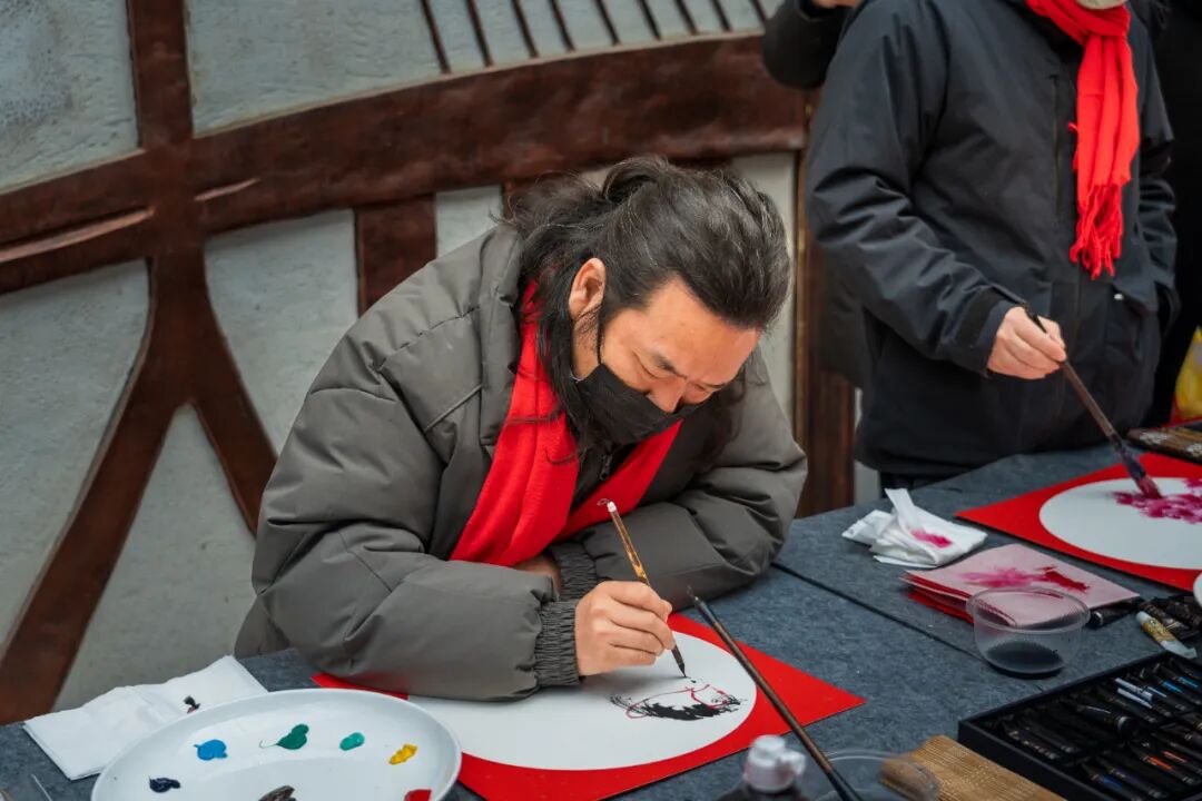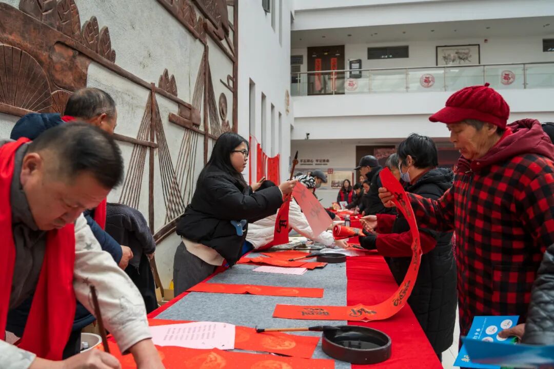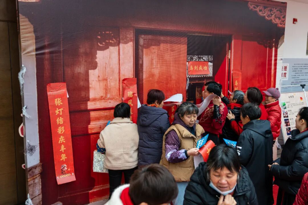 舞台一侧,笔墨飘香,红纸铺展,写春联、画年画、剪窗花的区域始终围着热情的居民。一副副满载祝福的春联,一张张精巧别致的窗花,在人们手中诞生,最传统、最真挚的新春祝愿也被居民陆续带回家中。