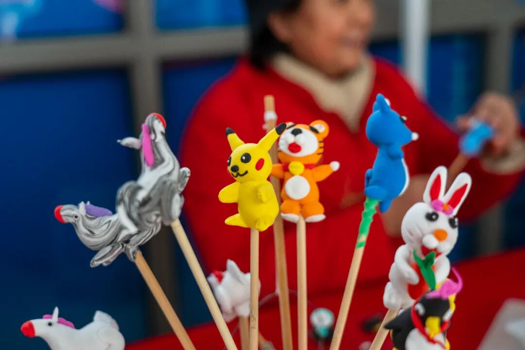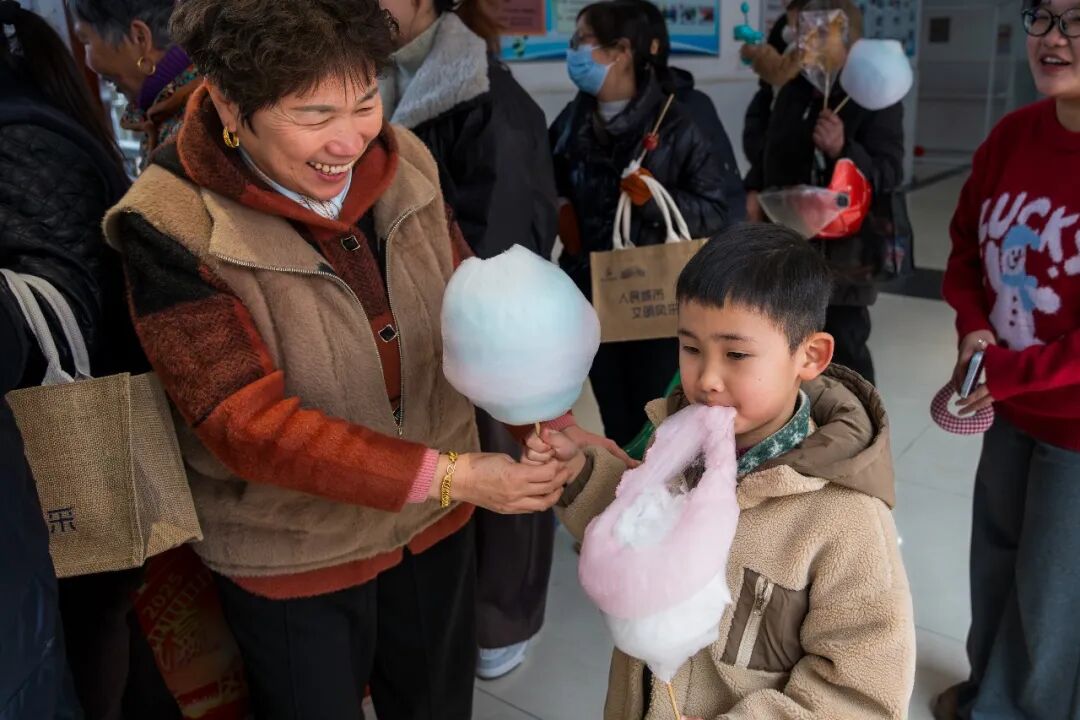 最受孩子们欢迎的莫过于年味区。糖画摊前,师傅手腕轻转,缕缕糖丝便神奇地化作腾飞的金龙或可爱的小马,引得孩子们连连鼓掌。一旁的棉花糖机嗡嗡作响,瞬间卷出一团团云朵般的甜蜜。捏泥人的摊位前,小朋友在艺人指导下,专注地捏塑着自己心中的新年形象。“看到小朋友们拿到糖画时开心的样子,就像看到了自己小时候,我觉得特别有意义。”陆女士告诉记者。