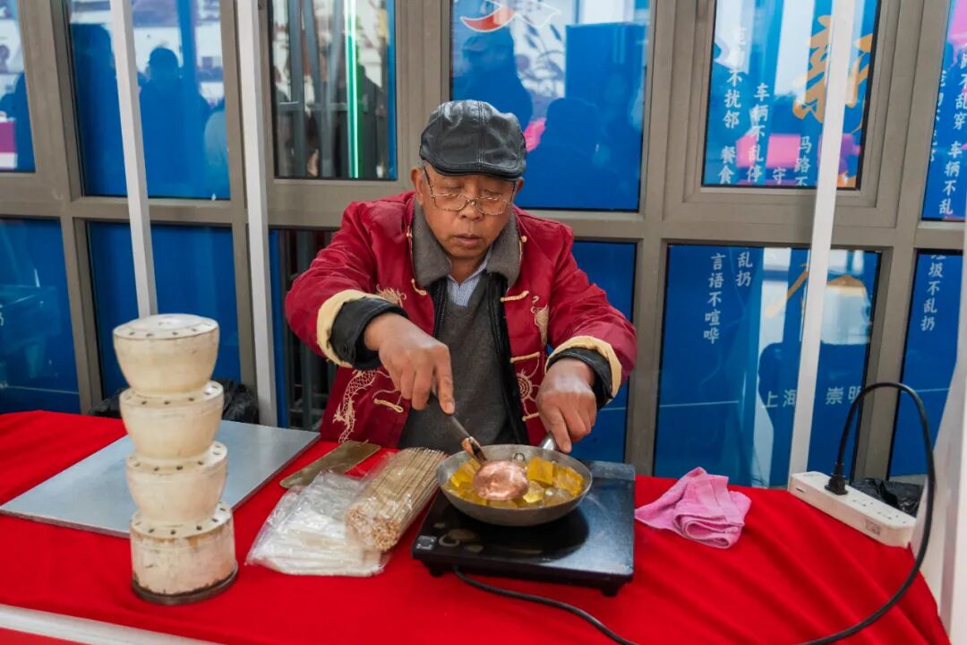 在年货区,东滩大米、崇明糕、崇明果蔬等本土特产琳琅满目,散发着诱人的香气,不少居民正在挑选心仪的年礼。一位带着孩子的母亲笑着说:“这里买的不仅是年货,更是我们崇明的味道。”