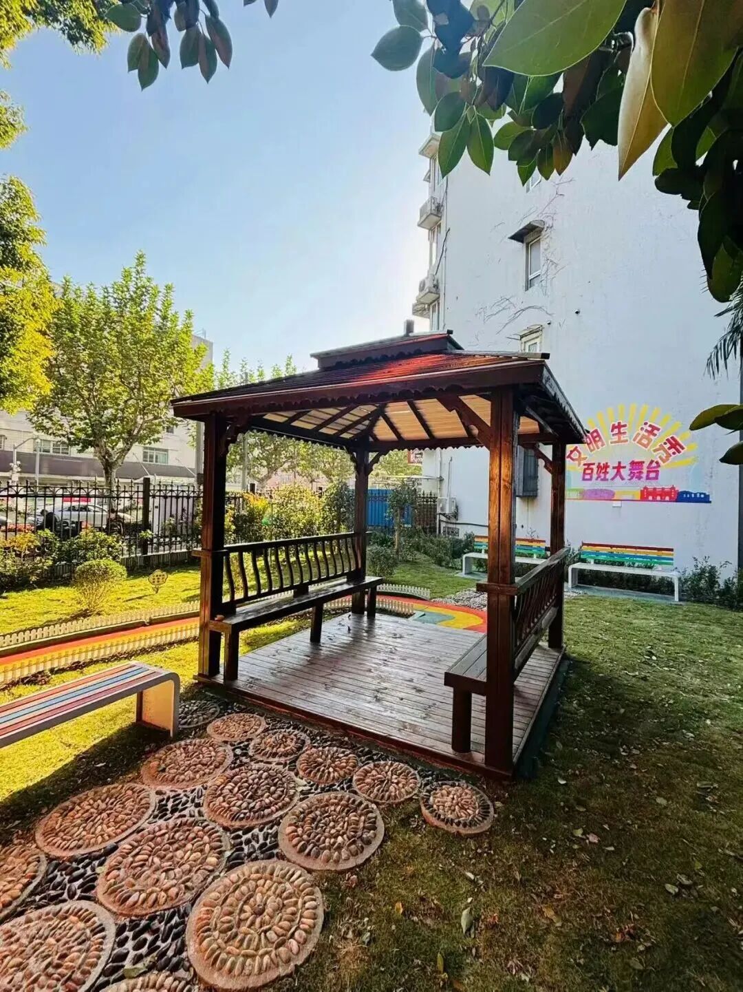 在这个过程中,居民不仅提出构想,更全程参与方案探讨、选材定色,在共建共治中让文明不再是抽象的概念,继而化作可触可感的生活场景。无论是蜿蜒的彩虹步道、围起安全区的白色栅栏还是居民亲手挑选的彩色座椅……如今这里常见孩童嬉戏、邻里闲谈,文明在欢声笑语中落地生根,在日常交融中枝繁叶茂。
