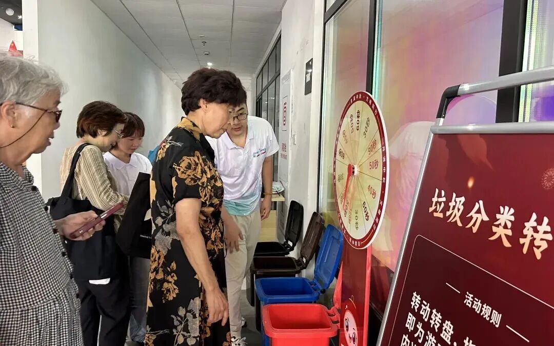 在“绿色环保·分类新生”主题活动区域,人头攒动,热闹非凡。街道城建中心工作人员精心设计的“垃圾分类转转乐”游戏,并提供了精美绿植,吸引了众多居民踊跃参与,大家通过转动转盘答题,挑战“易错垃圾”的分类。而“造旧·罐罐新生”工坊则让闲置物品重新焕发生机。工作人员一边向居民展示旧物改造的精美作品,一边详细介绍咖啡罐钥匙扣和旧布手机链的制作方法,环保理念在指尖不经意间传递开来。
