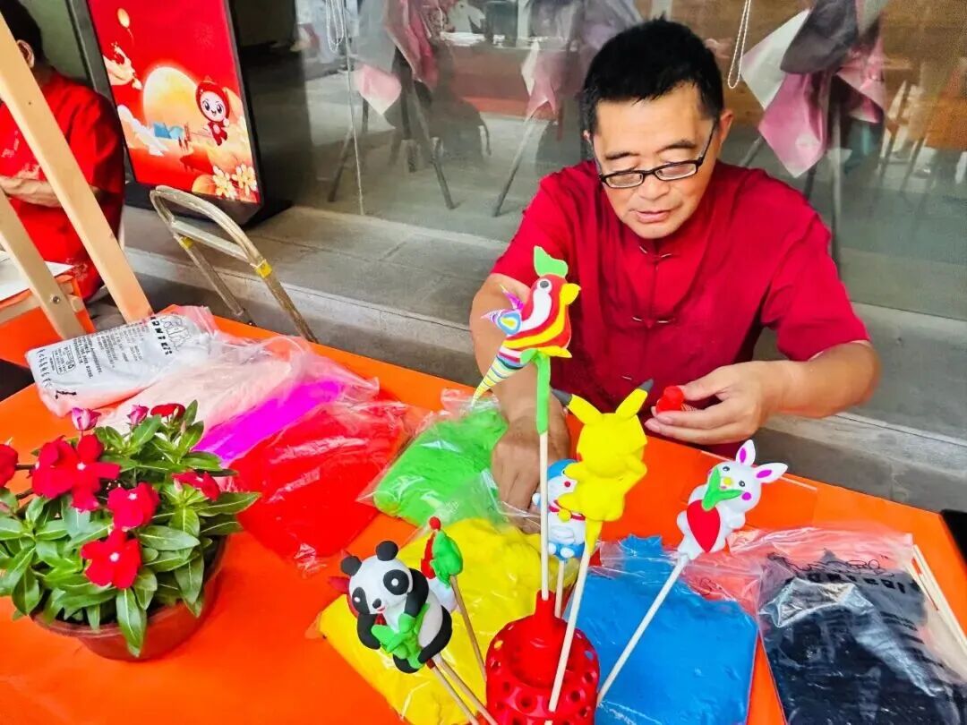 非遗手作区成了最受欢迎打卡点。上海中外文化艺术交流协会民间艺术研究院剪纸师汤扣成借助非遗剪纸技艺,向居民们传授剪纸技法,从寓意吉祥的福字到充满童趣的图案,让参与者深切感受传统手工艺的独特魅力。吕氏面塑传承人吕素华依据需求选取材料,在手中几番捏、揉、掀,再用小竹刀灵活地点、切、刻、划,塑出身躯、手臂、头面,为其披上发饰和衣裳,转眼间,一个栩栩如生的艺术形象便跃然手中。