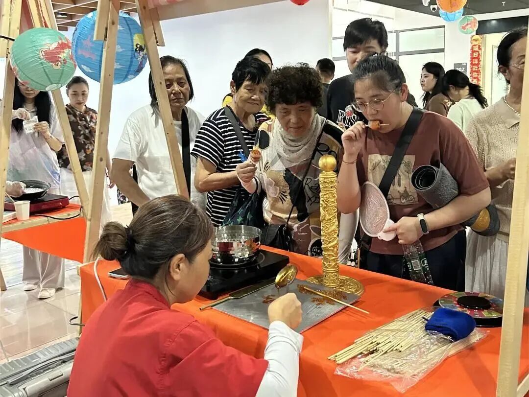 冰皮月饼DIY区,大家兴致勃勃地挑选着各式各样的模具,将面团轻轻压出精美的花纹,每一道纹路都承载着对传统节日的祝福。童年小吃铺前人声鼎沸,民间手艺人赵国芹娴熟地用糖浆勾勒出“中秋快乐”字样的糖画,这些充满童趣的作品供不应求。