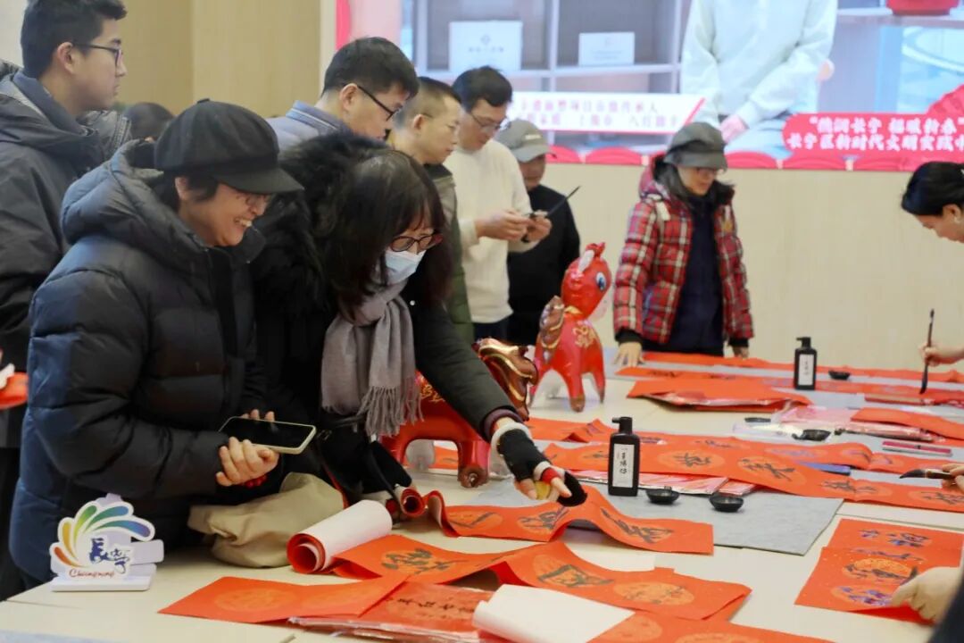 在“笔墨书马·国潮传家”区域,书法老师将狼毫饱蘸浓墨,挥毫泼墨;长宁区少年宫的小朋友们也化身小小书法家,写下对新年的祝福。两代人同挥笔墨书对联,如同一次文化传承——让青少年们在笔墨书香中感受汉字之美、体验传统之韵。