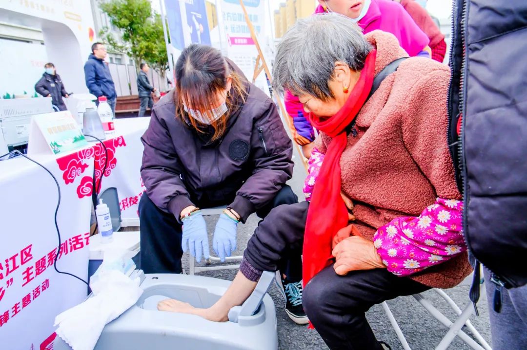 造型精巧的非遗剪纸、版画,绿意盎然的种苗农资,丰富实用的科普体检、大咖云集的爱心义诊……30余个展位前人潮涌动,热闹非凡。一早便迫不及待赶来的村民们一边逛展位,一边学常识,带着惠农物资满载而归。除了送上丰富多样的支农物资和精神文化大餐,现场还结合村民们的日常需求开设了居家康复指导、理发、足脊健康检测等便民服务项目,引得大家排起长队踊跃参与,认真咨询。