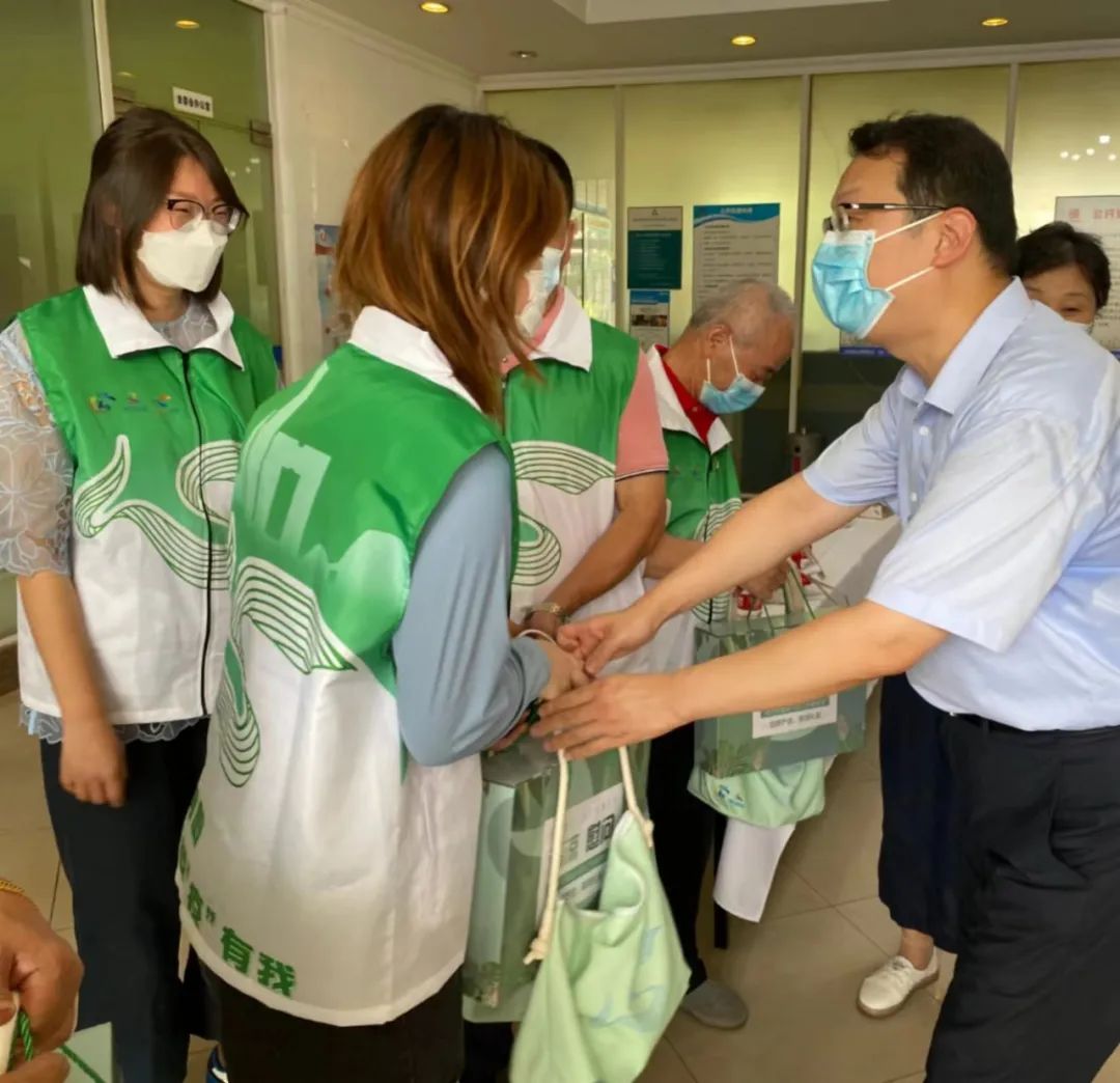 在屈家桥居民区和新泾五村,潘国力一行与常态化疫情防控志愿者亲切交流,他们之中有退休人员,也有刚刚参加完高考的准大学生。潘国立肯定了志愿者们在高温下坚持志愿服务的奉献精神,并为志愿者送上防暑用品和常态化疫情防控志愿者工作包。