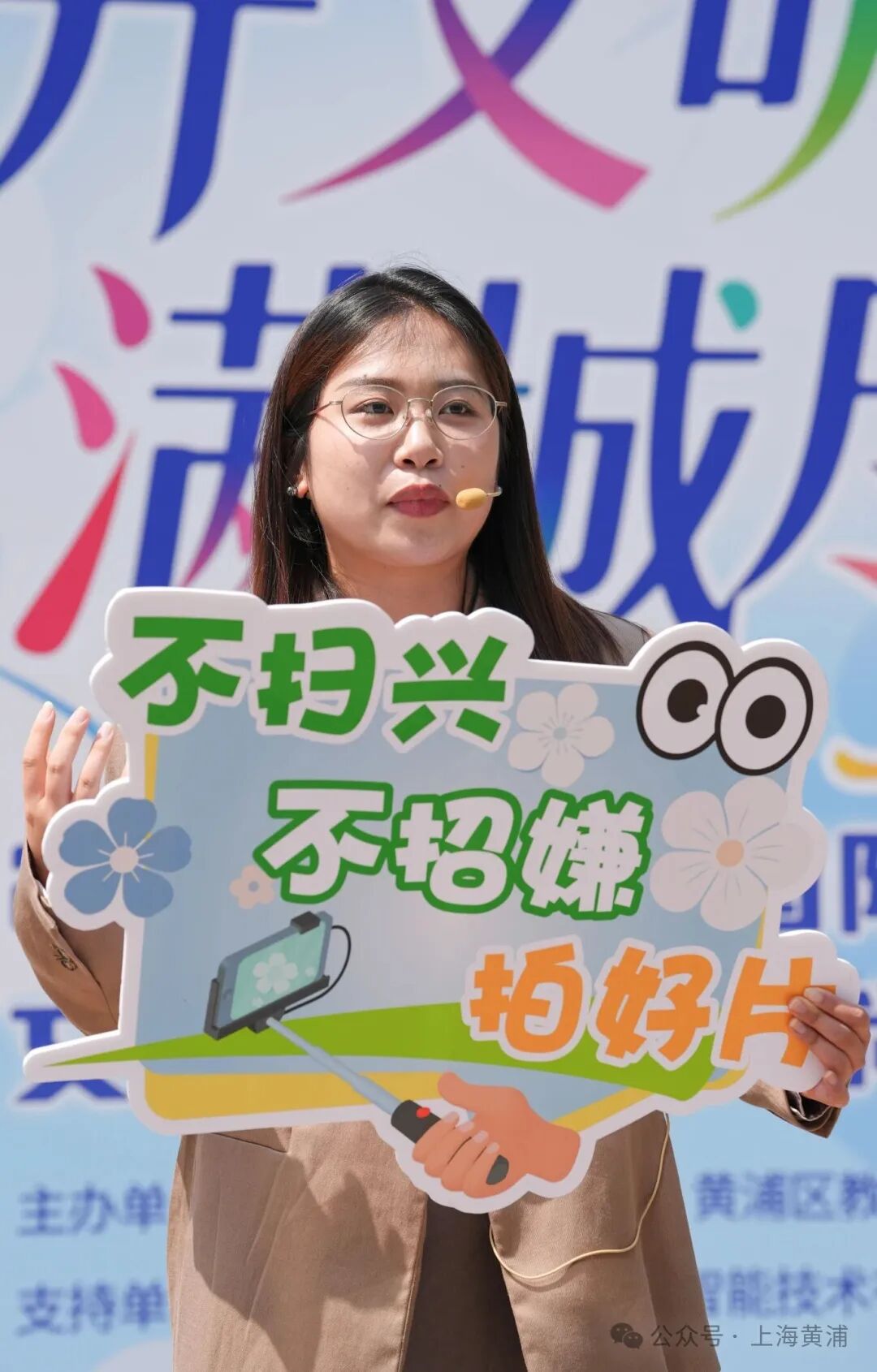 上师大附属黄浦梅溪小学的同学们带来了一首原创童谣《文明赏花谣》,拉开了本次活动的序幕。一场文明观展“开放麦”则直接点明主题,黄浦区绿化管理所施瑾、黄浦区城管执法局姚梦园、自媒体博主奥利奥小毛分别代表花卉节导赏员、城管执法队员、互联网优质内容创作者,从不同的角度向市民游客发出“文明观赏花展”的温馨提示。活动现场还发布了本届上海国际花卉节黄浦城市主会场的文明观展新风尚LOGO“文明蒲公英”。