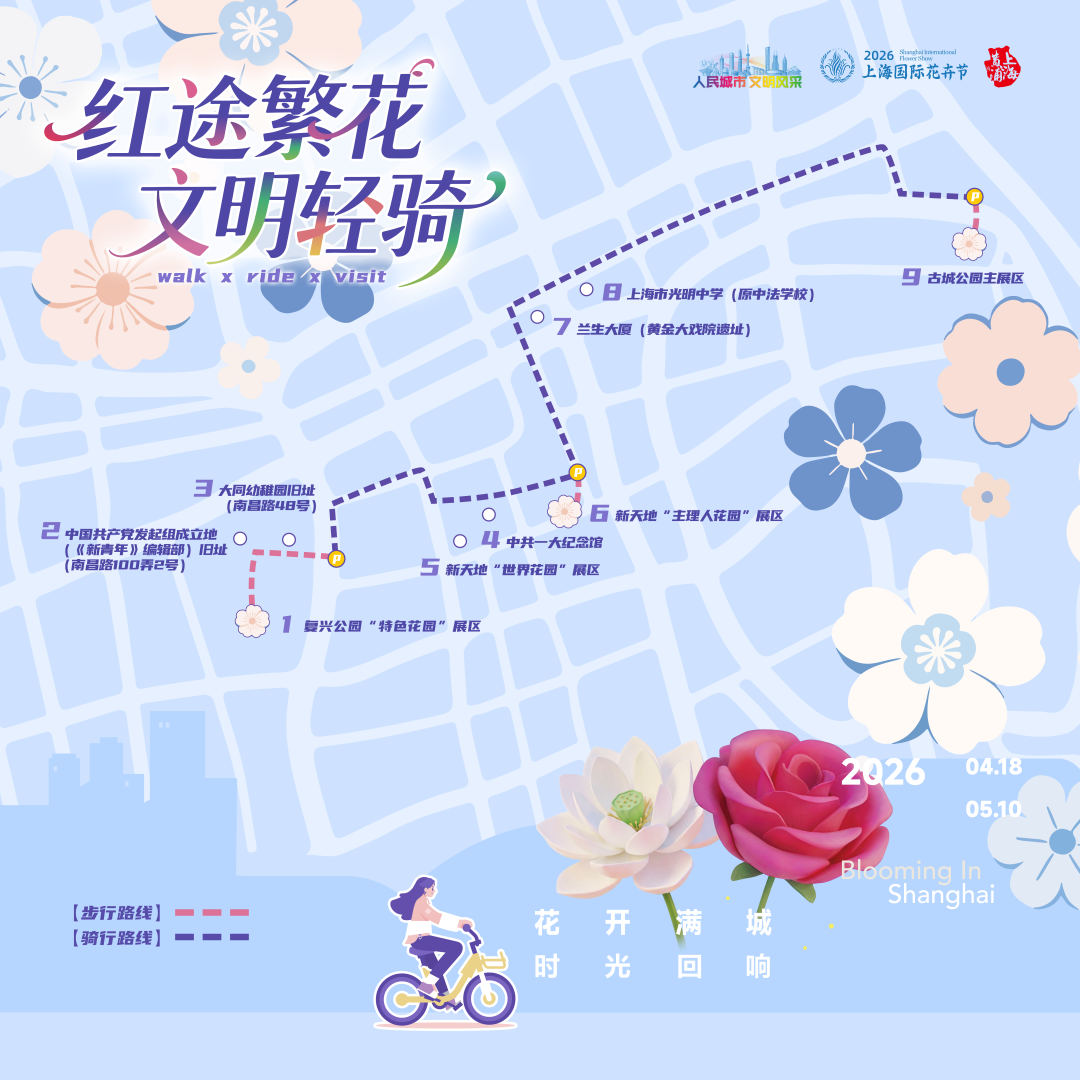 据了解,黄浦区委宣传部结合花卉节主题“花开满城 时光回响”,推出了“红途繁花·文明轻骑”主题路线,以“Walk+Ride+Visit”(步行+骑行+寻访)的创新形式,串联“红色露天博物馆”区域内多处重要革命旧址遗址与花卉节黄浦城市主会场的三大核心展区,让春日繁花与红色文脉同频共振,让市民游客在移步换景间,既赏满城花香,更与红色文化不期而遇。
