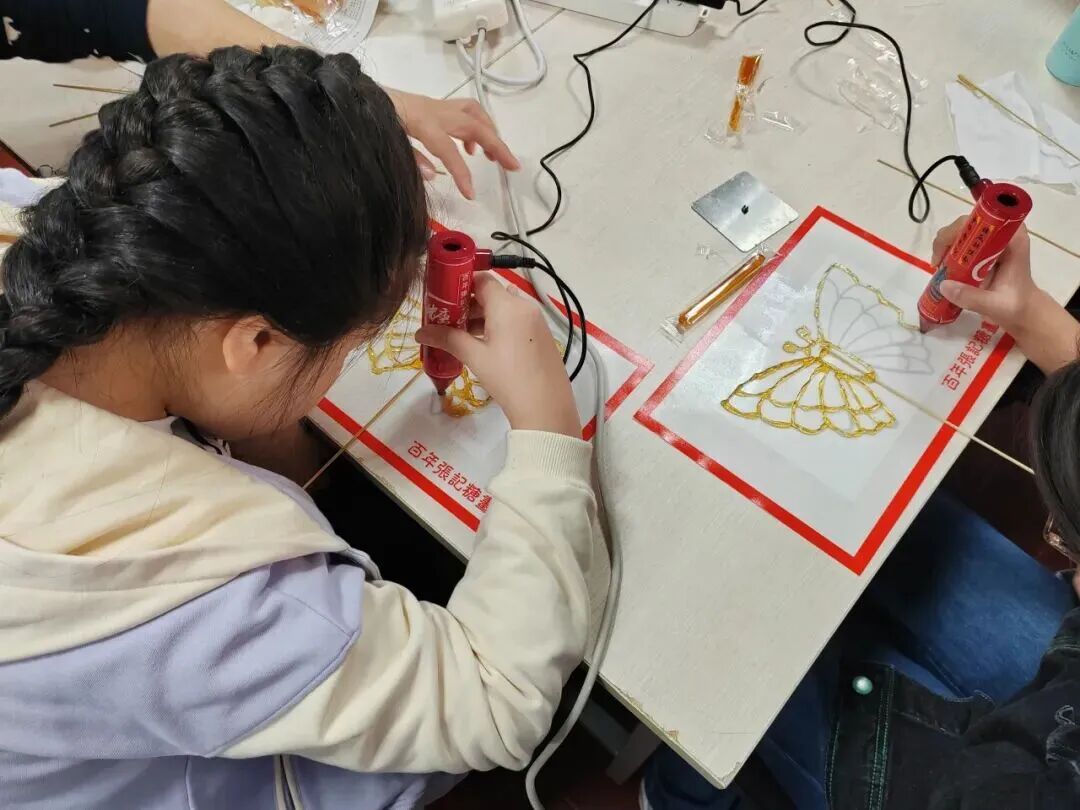 在老师的悉心指导下,孩子们化身“小匠人”,手持温热的糖笔在不粘板上尽情挥洒创意,小心翼翼地勾勒线条、屏息凝神地填充色彩,蝴蝶、小动物等一幅幅晶莹剔透、充满想象力的3D糖画作品在指尖逐渐成型,现场满是欢声笑语。完成创作后,孩子们迫不及待地举起自己的劳动成果品尝起来,甜甜的滋味在口中化开,而蕴含其中的传统文化魅力,也随着这份甜蜜悄然在心中扎根。