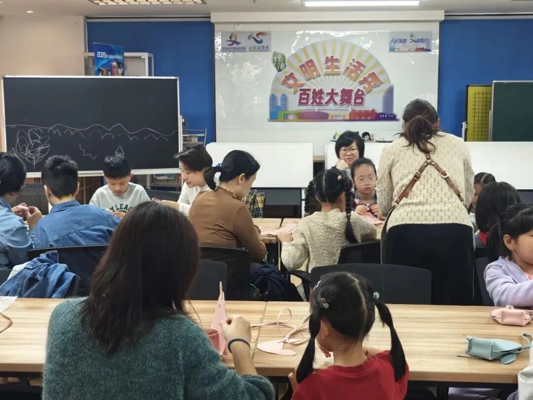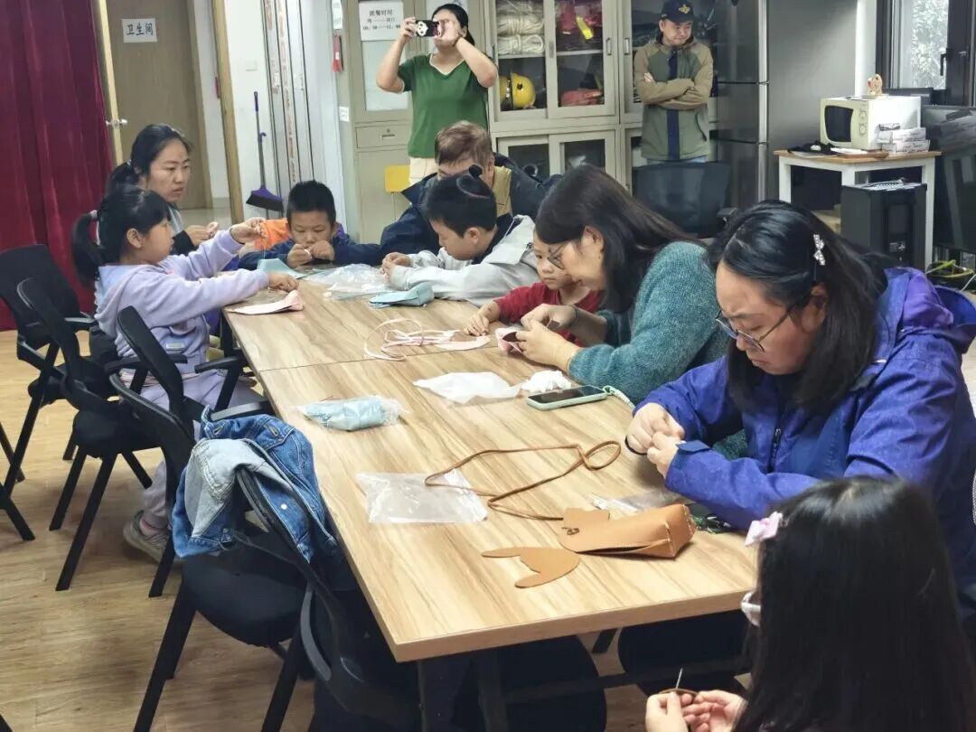 家长和孩子们围坐一堂,孩子们眼中满是好奇与认真,家长们耐心协助孩子完成每一个环节,亲子携手穿针引线,仔细勾勒兔子轮廓,不时交流技巧、分享创意,一步步将普通皮革打造成造型可爱的萌兔皮具。