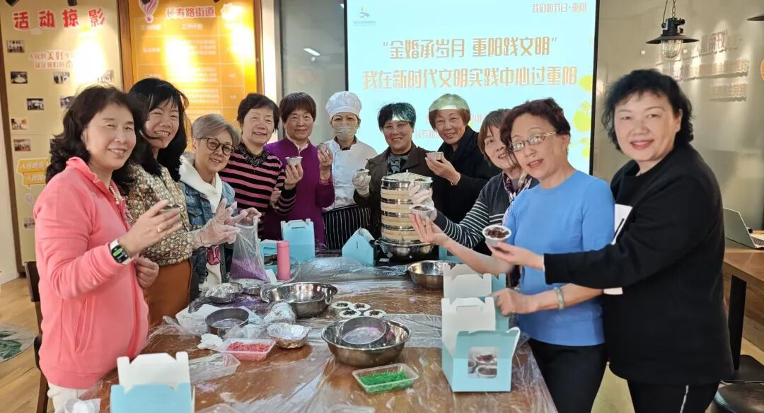 10月28日,长寿路街道新时代文明实践分中心开展“金婚承岁月重阳践文明”“我在新时代文明实践中心过重阳”暨重阳糕制作活动,多对携手逾半世纪的金婚夫妇参与活动。 通过“金婚故事分享”与“重阳文化工坊”双线并行,将家庭美德建设与非遗文化传承有机融合,构建起传统节日的现代文明实践样本。