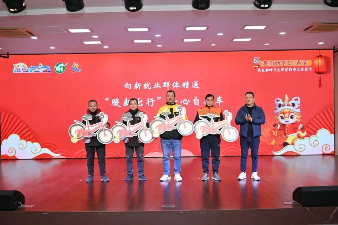 领导嘉宾向各界代表赠送了满载祝福的春联,传递对共建美好家园的殷切期望,向新就业群体代表赠送了“暖新出行”爱心自行车,向辛勤服务城市的守护者们致以诚挚敬意与节日关怀,让暖心举措真正融入城市文明肌理。
