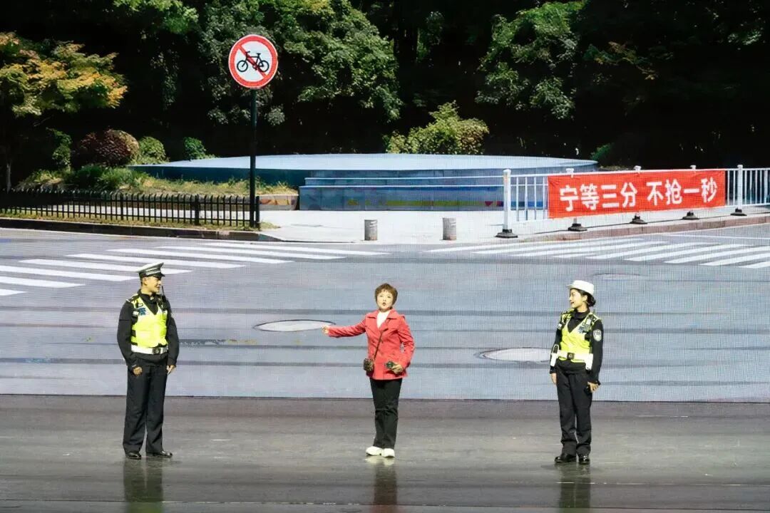 活动以儿童音乐剧《白兔好司机》拉开序幕,通过童趣故事演绎遵守交规的重要性,现场观众尤其是青少年群体在欢声笑语中接受安全启蒙。随后,上海滑稽剧团指导杨浦交警、市民群众共同演绎的小品《“骑”遇》,以幽默方式呈现非机动车道上的文明细节,引发共鸣。“科技”让城市运行更高效,互动访谈类节目《人民城市“治”慧先锋》讲述了“中国好人”、杨浦交警倪嘉辉运用“小科技”优化“大交通”,展现了新时期公安交管工作的“新质战斗力”。活动还现场展演了“全国优秀交通安全宣传作品”,由江西九江交管支队带来的情景剧《路口》,通过真实的事故案例改编,以动情的演绎敲响平安出行的警钟。随后,音乐说唱《“绿”动》以青春旋律传递文明出行理念,将活动推向高潮。