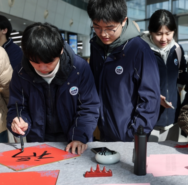 华东师范大学“人人写春联”传统文化活动在闵行校区图书馆举行。师生们铺纸研墨,挥毫书写,在横竖撇捺间体悟书法之美,以翰墨传递新春祝福。活动现场,美术学院书法专业研究生为师生们创作春联与“福”字,吸引众多师生排队领取或亲自提笔尝试。活动吸引了国际学生积极参与,他们手写“福”字,用中文互道祝福,成为文明交流的生动一幕。这场活动让师生在笔墨浸润中增强文化自信,既以翰墨书香赓续中华优秀传统文化脉络,更以中外师生的互动交融彰显开放包容的文明气象。