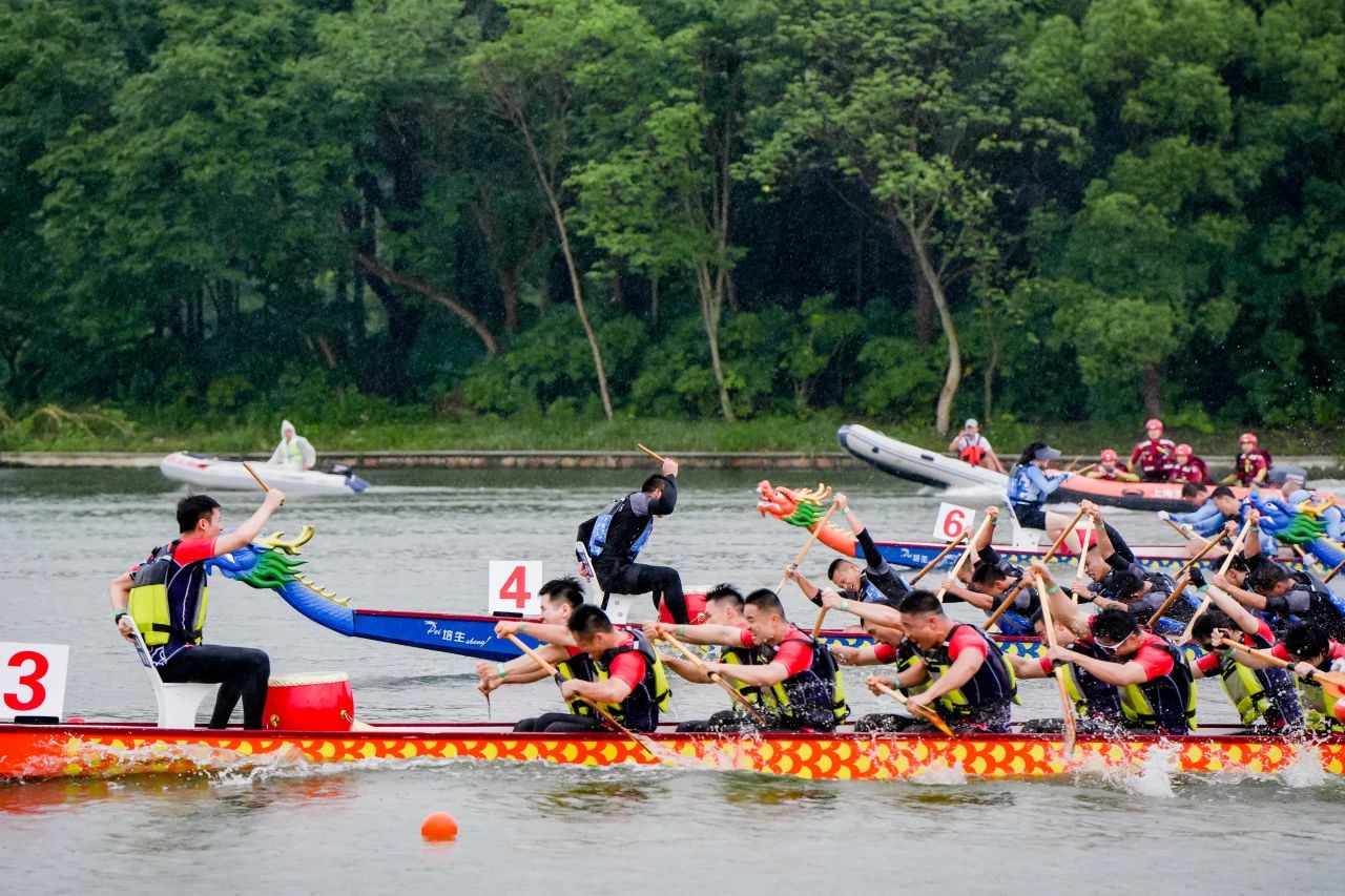 风雨同舟,挥桨激浪,龙舟争渡,雄姿英发。比赛当日,一艘艘龙舟整装待发、跃跃欲试,只听发令枪响,水面鼓声四起,水花飞溅,队员们你追我赶、团结前进,擂鼓声、口号声此起彼伏,掀起阵阵高潮。经过激烈角逐,36支参赛队伍中有24支队伍进入复赛,6支队伍脱颖而出进入决赛。