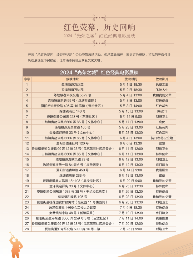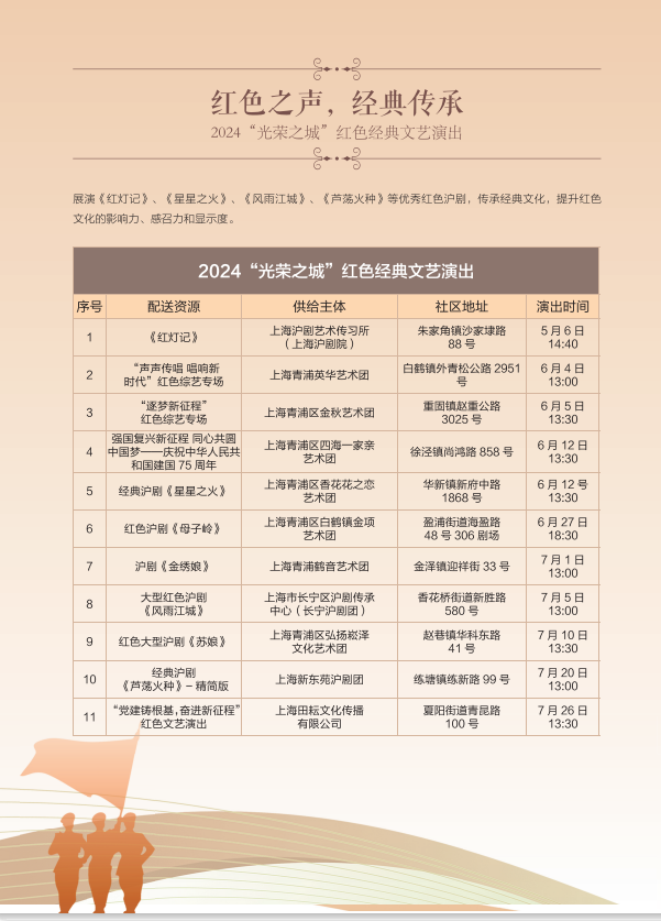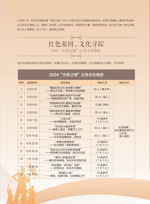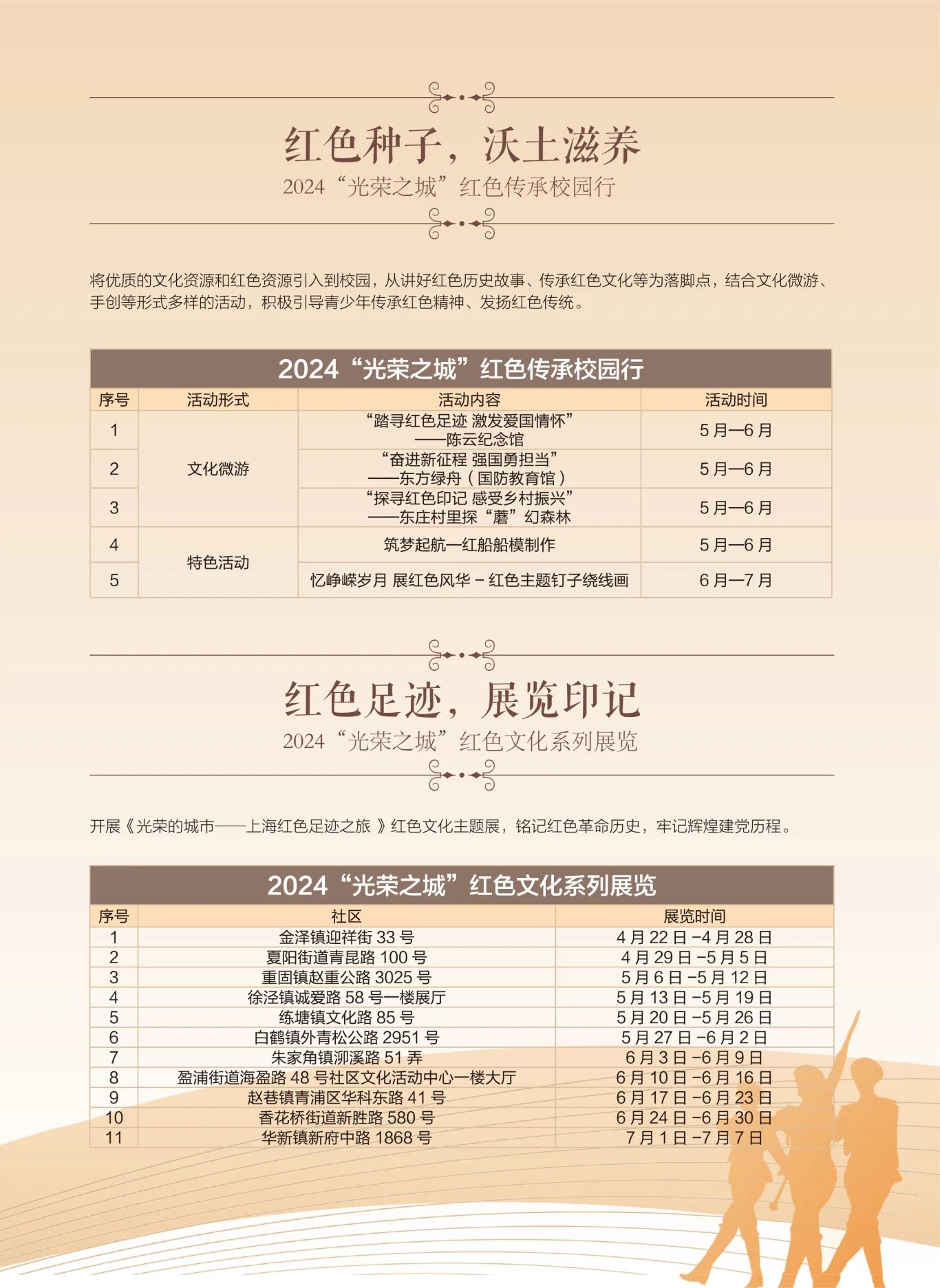 “我们将于5月-7月,以文化微游、文艺演出、系列展览、电影展映和校园行等形式,以红色基因、红色之声、红色足迹、红色银幕和红色种子等五大主题,在全区范围开展2024‘光荣之城’红色文化专题配送主题季活动。”青浦区文化和旅游管理事务中心文化市场科科长王海燕告诉记者。