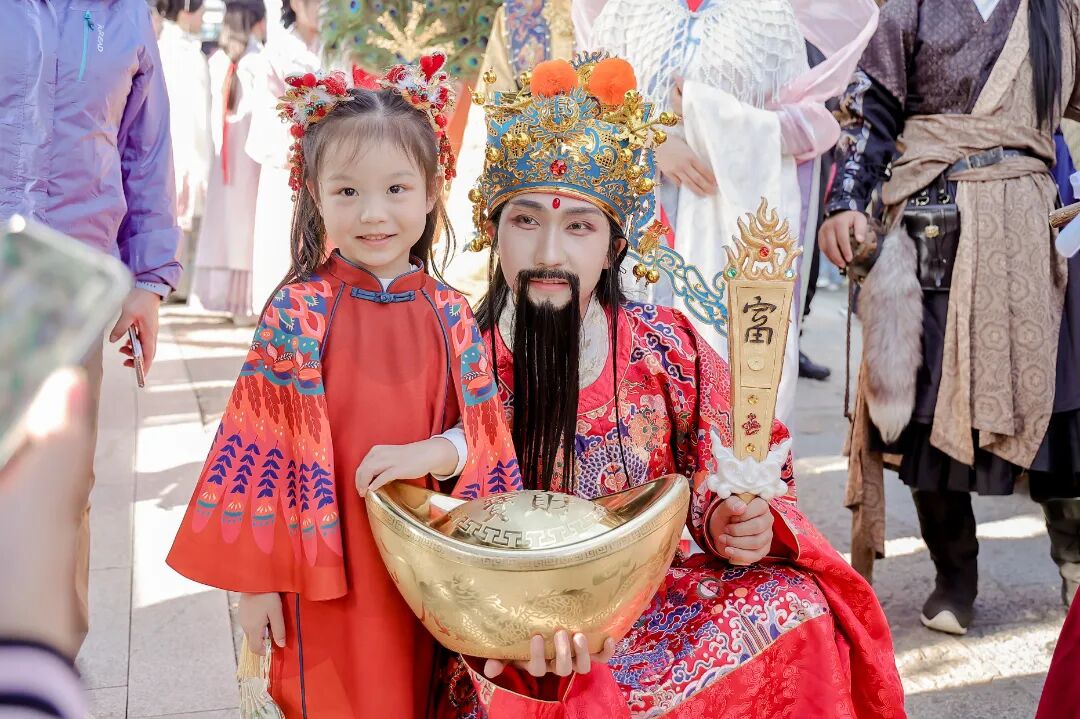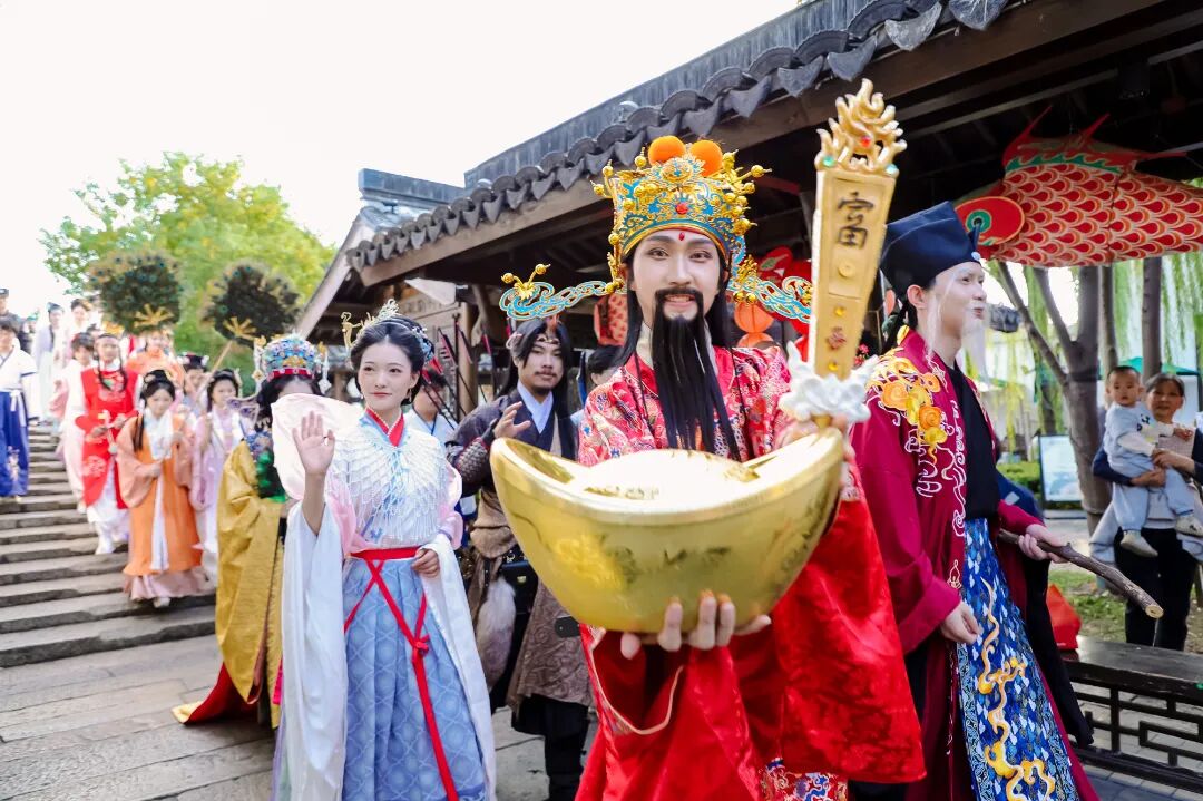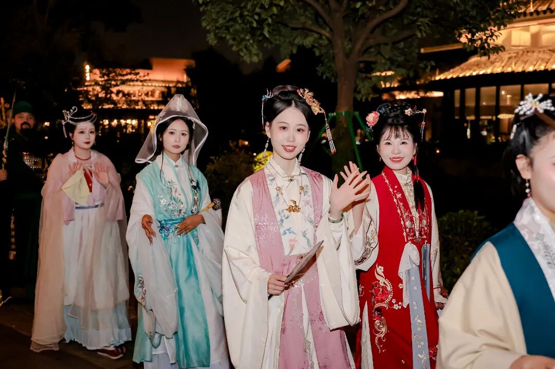 另外,让人眼前一亮的是,各具特色的中华经典人物以巡游方阵从烟雨长廊处陆续登场,将气氛推向高潮,开启了一场穿越古今的奇幻之旅。东方神话方阵率先踏光而行,财神、嫦娥引领民俗浪漫;“四大名著”方阵中,金陵十二钗衣袂翩跹,孙悟空金箍棒舞动生风;文人墨客方阵中,李白举杯,李清照执扇,尽显江南文韵。